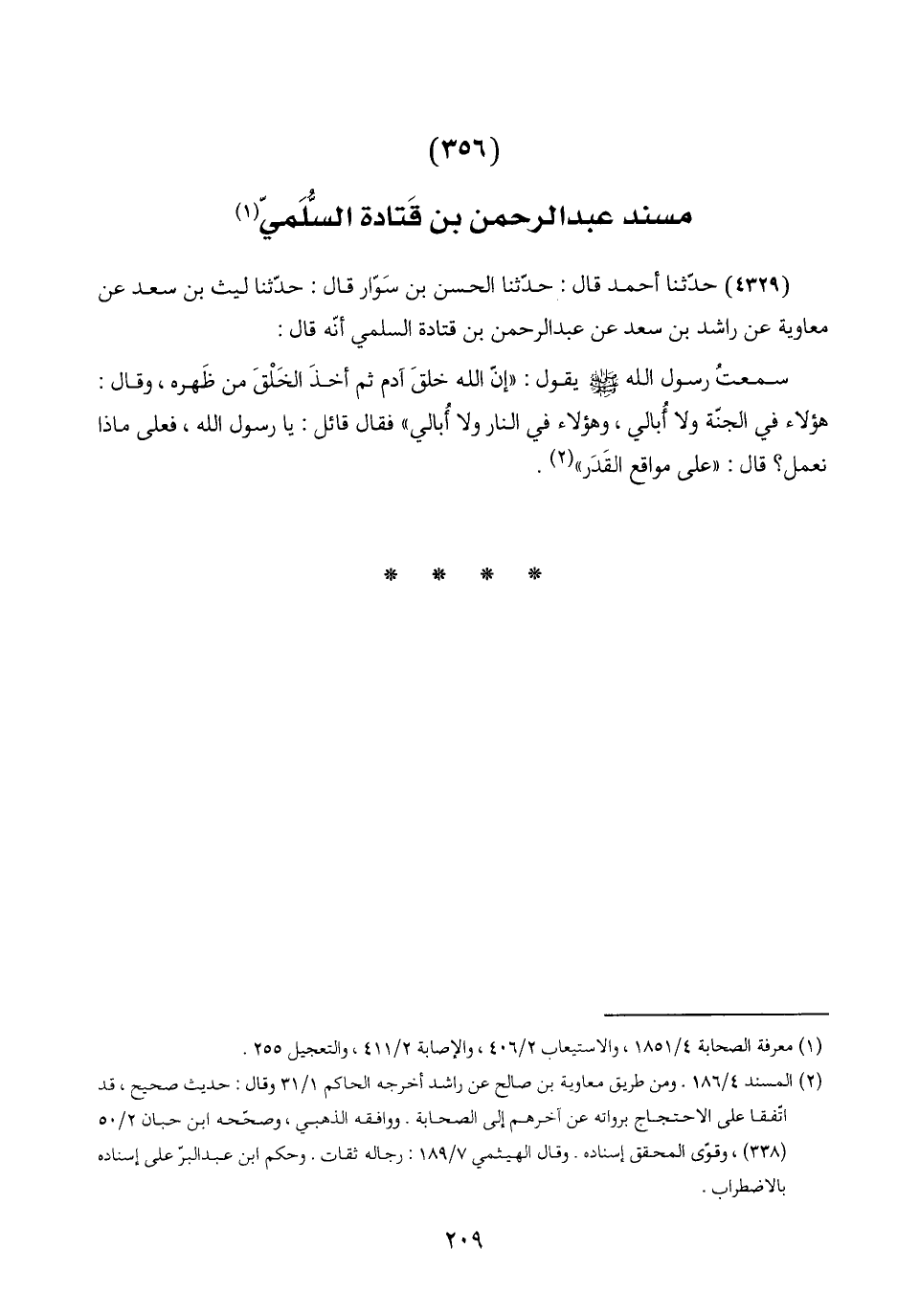 (٤٣٢٩) حدّثنا أحمد قال: حدّثنا الحسن بن سَوّار قال: حدّثنا ليث بن سعد عن معاوية عن راشد بن سعد عن عبد الرحمن بن قتادة السلمي أنّه قال:
