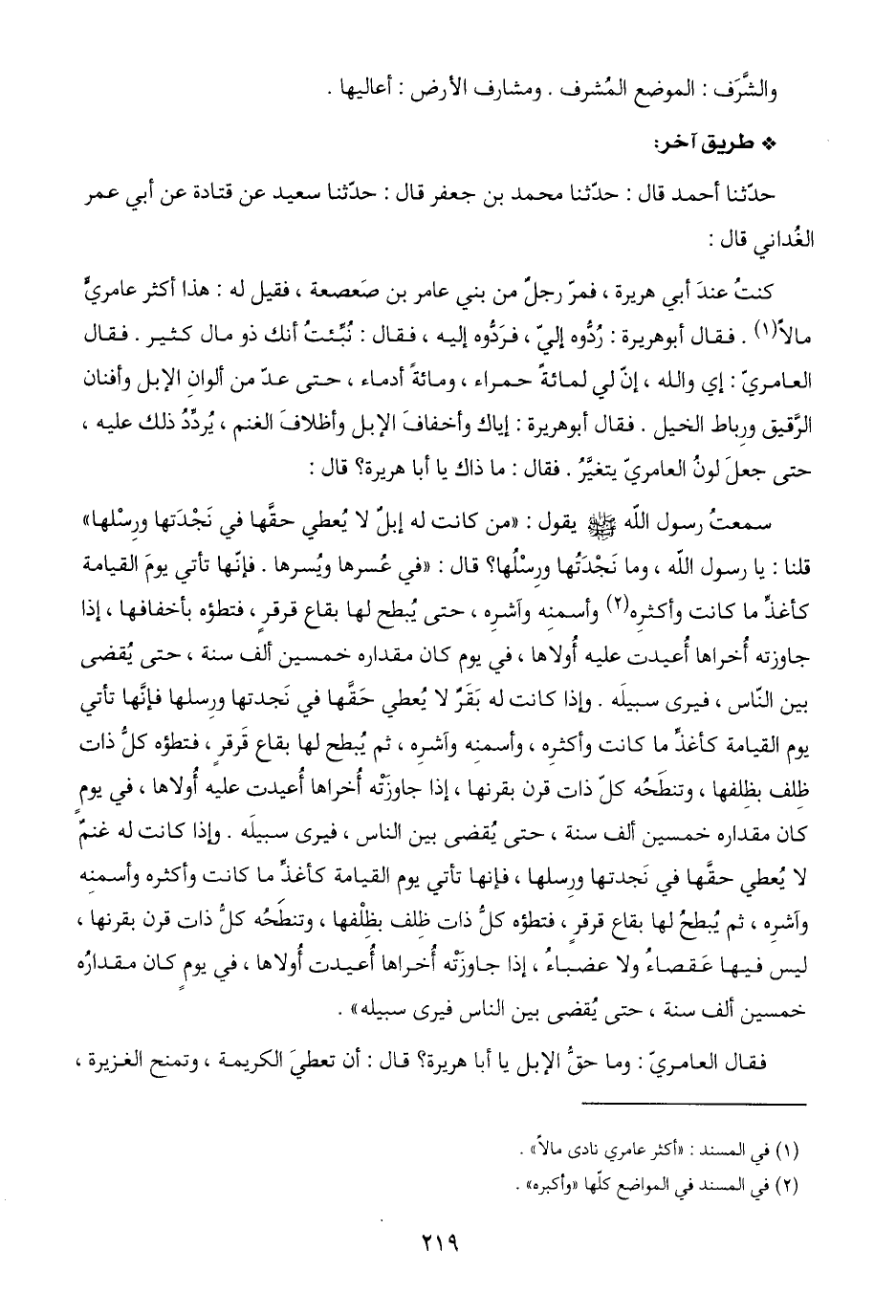 سمعتُ رسول اللَّه -صلى اللَّه عليه وسلم- يقول: "من كانت له إبلٌ لا يُعطي حقَّها في نَجْدَتها ورِسْلها" قلنا: يا رسول اللَّه، وما نَجْدَتُها ورِسْلُها؟ قال: "في عُسرها ويُسرها. فإنّها تأتي يومَ القيامة كأغذِّ ما كانت وأكثرِه (٢) وأسمنِه وآشرِه، حتى يُبطح لها بقاع قرقرٍ، فتطؤه بأخفافها، إذا جاوزته أُخراها أُعيدت عليه أُولاها، في يوم كان مقداره خمسين ألف سنة، حتى يُقضى بين النّاس، فيرى لسبيلَه. وإذا كانت له بَقَرٌ لا يُعطي حَقَّها في نَجدتها ورِسلها فإنَّها تأتي يوم القيامة كأغذِّ ما كانت وأكثرِه، وأسمنِه وآشرِه، ثم يُبطح لها بقاع قَرقرٍ، فتطؤه كلُّ ذات ظِلف بظِلفها، وتنطَحُه كل ذات قرن بقرنها، إذا جاوزَتْه أُخراها أُعيدت عليه أُولاها، في يومٍ كان مقداره خمسين ألف سنة، حتى يُقضى بين النّاس، فيرى سبيلَه. وإذا كانت له غنمٌ لا يُعطي حقَّها في نَجدتها ورِسلها، فإنها تأتي يوم القيامة كأغذِّ ما كانت وأكثره وأسمنِه وآشرِه، ثم يُبطحُ لها بقاع قرقرٍ، فتطؤه كلُّ ذات ظِلف بظِلْفها، وتنطَحُه كلُّ ذات قرن بقرنها، ليس فيها عَقصاءُ ولا عضباءُ، إذا جاورته أُخراها أُعيدت أُولاها، في يومٍ كان مقدارُه خمسين ألف سنة، حتى يُقضى بين النّاس فيرى سبيله".