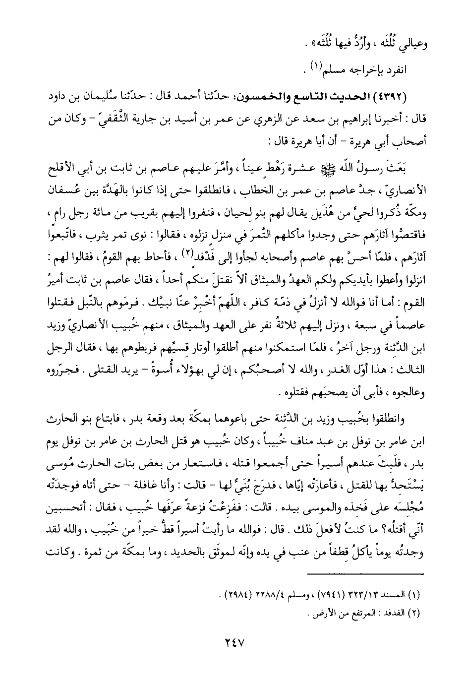 بَعَثَ رسولُ اللَّه -صلى اللَّه عليه وسلم- عشرة رَهْطٍ عينًا، وأمَّرَ عليهم عاصم بن ثابت بن أبي الأقلح الأنصاريّ، جدَّ عاصم بن عمر بن الخطاب، فانطلقوا حتى إذا كانوا بالهَدَّة بين عُسفان ومكة ذُكروا لحيٍّ من هُذَيل يقال لهم بنو لِحيان، فنفروا إليهم بقريب من مائة رجل رامٍ، فاقتصُّوا آثارَهم حتى وجدوا مأكلهم التَّمرَ في منزلٍ نزلوه، فقالوا: نوى تمر يثرب، فاتّبعوا آثارَهم، فلمّا أحسَّ بهم عاصم وأصحابه لجأوا إلى فَدْفٍد (٢)، فأحاط بهم القومُ، فقالوا لهم: انزلوا وأعطوا بأيديكم ولكم العهدُ والميثاق ألّا نقتلَ منكم أحدًا، فقال عاصم بن ثابت أميرُ القوم: أما أنا فواللَّه لا أنزلُ في ذمّة كافر، اللهمّ أخْبِرْ عنّا نبيَّك. فرمَوهم بالنّبل فقتلوا عاصمًا في سبعة، ونزل إليهم ثلاثةُ نفر على العهد والميثاق، منهم خُبيب الأنصاريّ وزيد ابن الدَّثِنة ورجل آخرُ، فلمّا استمكنوا منهم أطلقوا أوتار قِسيِّهم فربطوهم بها، فقال الرجل الثالث: هذا أوّل الغدر، واللَّه لا أصحبُكم، إنّ لي بهؤلاء أُسوةً - يريد القتلى. فجرّروه وعالجوه، فأبى أن يصحبَهم فقتلوه.