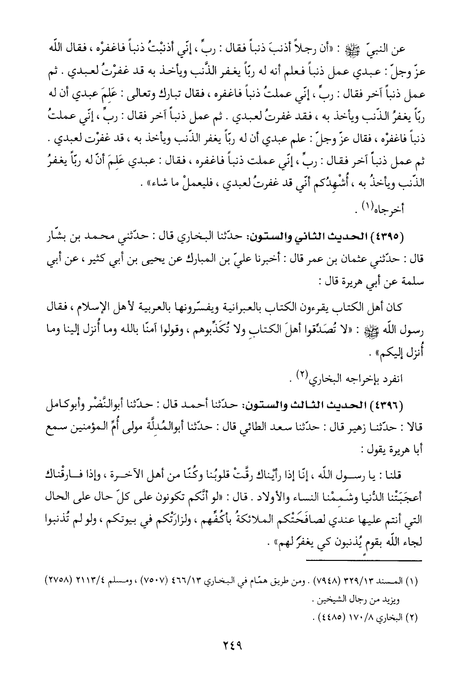 عن النبيّ -صلى اللَّه عليه وسلم-: "أن رجلًا أذنبَ ذنبًا فقال: ربِّ، إنّي أذنبْتُ ذنبًا فاغفرْه، فقال اللَّه عزّ وجلّ: عبدي عمل ذنبًا فعلم أنّه له ربًّا يغفر الذَّنب ويأخذ به قد غفرْتُ لعبدي. ثم عمل ذنبًا آخر فقال: ربِّ، إني عملتُ ذنبًا فاغفره، فقال تبارك وتعالى: عَلِمَ عبدي أن له ربًّا يغفرُ الذّنب ويأخذ به، فقد غفرتُ لعبدي. ثم عمل ذنبًا آخر فقال: ربِّ، إنّي عملتُ ذنبًا فاغفرْه، فقال عزّ وجلّ: علم عبدي أن له ربًّا يغفر الذنب ويأخذ به، قد غفرْت لعبدي. ثم عمل ذنبًا آخر فقال: ربِّ، إنّي عملت ذنبًا فاغفره، فقال: عبدي عَلِمَ أنّ له ربًّا يغفرُ الذّنب ويأخذ به، أُشْهِدُكم أنّي قد غفرتُ لعبدي، فليعملْ ما شاء".