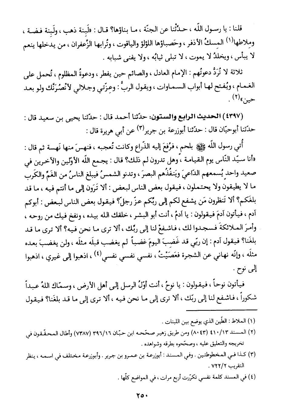 (٢) المسند ١٣/ ٤١٠ (٨٠٤٣) ومن طريق زهير صحّحه ابن حبّان ١٦/ ٣٩٦ (٧٣٨٧) وأطال المحقّقون في تخريجه والتعليق عليه، وصحّحوه بطرقه وشواهده.