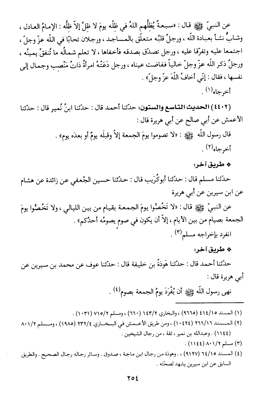 نهى رسول اللَّه -صلى اللَّه عليه وسلم- أن يُفْرَدَ يومُ الجمعة بصوم (٤).