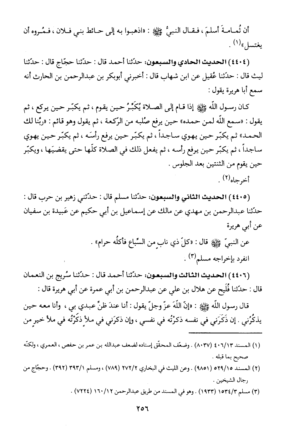 (٤٤٠٦) الحديث الثالث والسبعون: حدّثنا أحمد قال: حدّثنا سُريج بن النعمان قال: حدّثنا فُلَيح عن هلال بن علي عن عبد الرحمن بن أبي عمرة عن أبي هريرة قال: