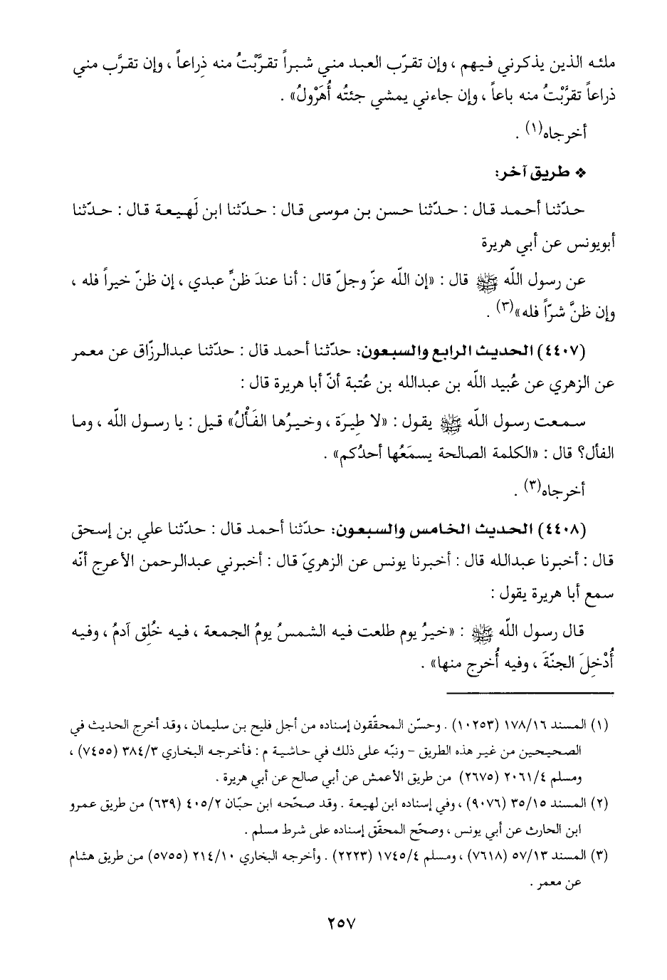 (١) المسند ١٦/ ١٧٨ (١٠٢٥٣). وحسّن المحقّقون إسناده من أجل فليح بن سليمان، وقد أخرج الحديث في الصحيحين من غير هذه الطريق - ونبّه على ذلك في حاشية م: فأخرجه البخاري ٣/ ٣٨٤ (٧٤٥٥)، ومسلم ٤/ ٢٠٦١ (٢٦٧٥) من طريق الأعمش عن أبي صالح عن أبي هريرة.