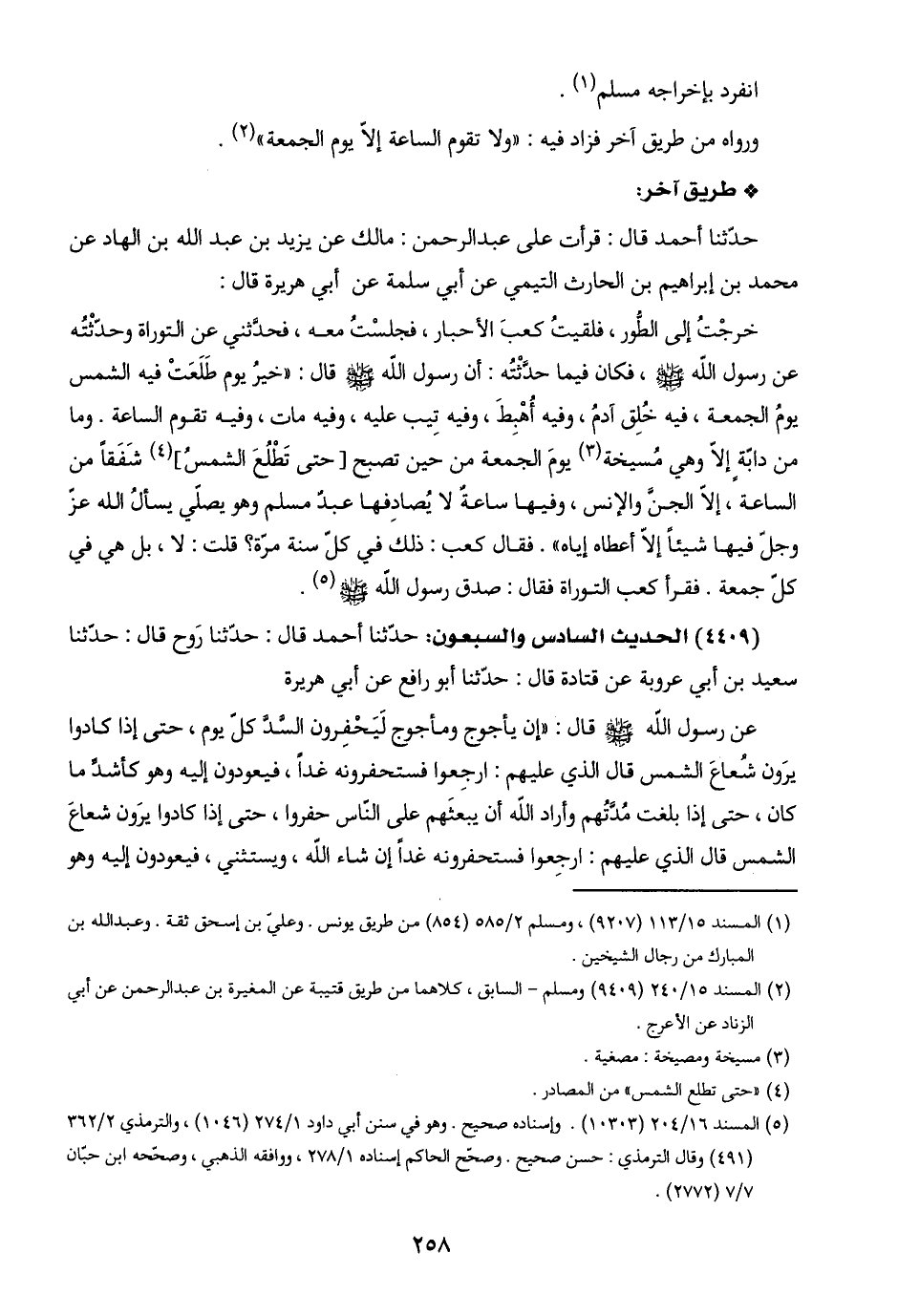 ورواه من طريق آخر فزاد فيه: "ولا تقوم الساعة إلّا يوم الجمعة" (٢).