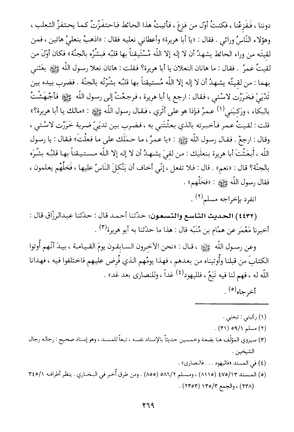 وعن رسول اللَّه -صلى اللَّه عليه وسلم-، قال: "نحن الآخِرون السّابِقون يومَ القيامة، بيدَ أنّهم أُوتوا الكتابَ من قبلنا وأُوتيناه من بعدهم، فهذا يومُهم الذي فُرِض عليهم فاختلفوا فيه، فهدانا اللَّه له، فهم لنا فيه تَبَعٌ، فلليهود (٤) غدًا، وللنصارى بعد غد".