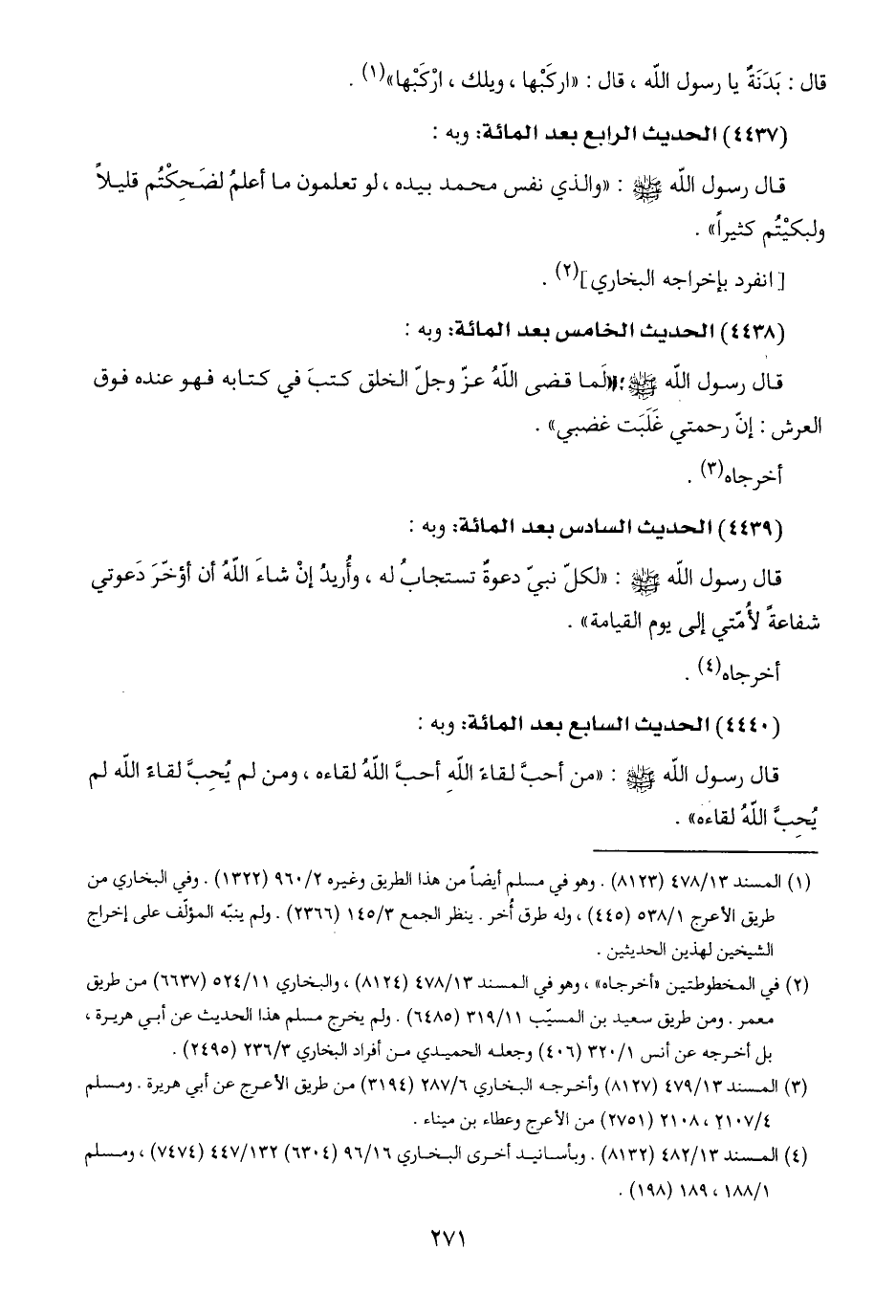 (٤) المسند ١٣/ ٤٨٢ (٨١٣٢). وبأسانيد أخرى البخاري ١٦/ ٩٦ (٦٣٠٤) ١٣٢/ ٤٤٧ (٧٤٧٤)، ومسلم ١/ ١٨٨، ١٨٩ (١٩٨).