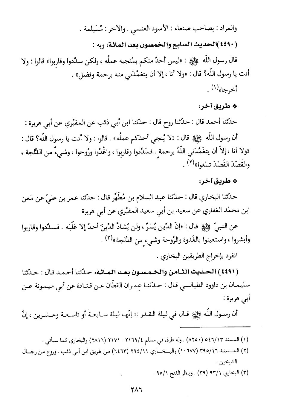 عن النبيّ -صلى اللَّه عليه وسلم- قال: "إنّ الدِّين يُسْرٌ، ولن يُشادَّ الدِّينَ أحدٌ إلا غلَبَه. فسدِّدوا وقاربوا وأبشروا، واستعينوا بالغَدوة والرَّوحة وشيءٍ من الدُّلجة" (٣).