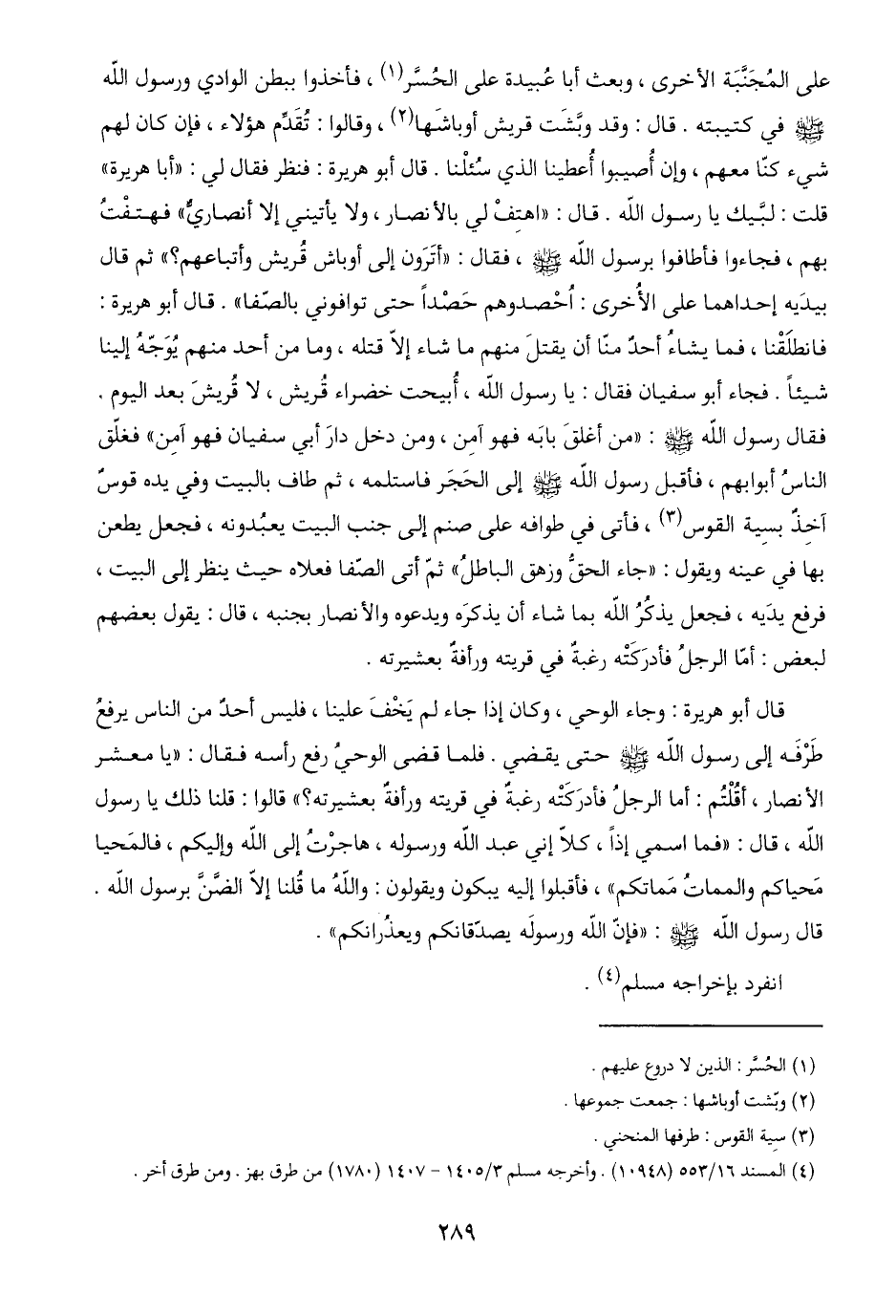 على المُجَنَّبَة الأخرى، وبعث أبا عُبيدة على الحُسَّر (١)، فأخذوا ببطن الوادي ورسول اللَّه -صلى اللَّه عليه وسلم- في كتيبته. قال: وقد وبَّشَت قريش أوباشَها (٢)، وقالوا: تُقَدِّم هؤلاء، فإن كان لهم شيء كنّا معهم، وإن أُصيبوا أُعطينا الذي سُئلْنا. قال أبو هريرة: فنظر فقال لي: "أبا هريرة" قلت: لبَّيك يا رسول اللَّه. قال: "اهتِفْ لي بالأنصار، ولا يأتيني إلا أنصاريٌّ" فهتفْتُ بهم، فجاءوا فأطافوا برسول اللَّه -صلى اللَّه عليه وسلم-، فقال: "أتَرَون إلى أوباش قُريش وأتباعهم؟ " ثم قال بيدَيه إحداهما على الأُخرى: اُحْصدوهم حَصْدًا حتى توافوني بالصّفا". قال أبو هريرة: فانطلَقْنا، فما يشاءُ أحدٌ منّا أن يقتلَ منهم ما شاء إلّا قتله، وما من أحد منهم يُوَجّهُ إلينا شيئًا. فجاء أبو سفيان فقال: يا رسول اللَّه، أُبيحت خضراء قريش، لا قُريشَ بعد اليوم. فقال رسول اللَّه -صلى اللَّه عليه وسلم-: "من أغلقَ بابَه فهو آمِن، ومن دخل دارَ أبي سفيان فهو آمِن" فغلّق الناسُ أبوابهم، فأقبل رسول اللَّه -صلى اللَّه عليه وسلم- إلى الحَجَر فاستلمه، ثم طاف بالبيت وفي يده قوسٌ آخِذٌ بسِية القوس (٣)، فأتى في طوافه على صنم إلى جنب البيت يعبُدونه، فجعل يطعن بها في عينه ويقول: "جاء الحقُّ وزهق الباطلُ" ثمّ أتى الصّفا فعلاه حيث ينظر إلى البيت، فرفع يدَيه، فجعل يذكُرُ اللَّه بما شاء أن يذكرَه ويدعوه والأنصار بجنبه، قال: يقول بعضهم لبعض: أمّا الرجلُ فأدرَكَتْه رغبةٌ في قريته ورأفةٌ بعشيرته.