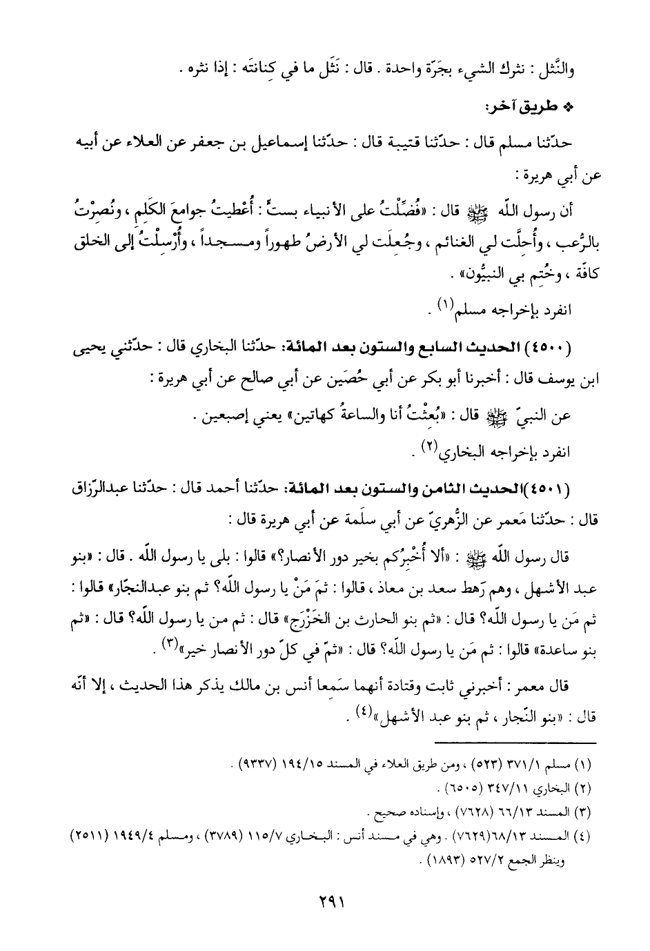 (٤) المسند ١٣/ ٦٨ (٧٦٢٩). وهي في مسند أنس: البخاري ٧/ ١١٥ (٣٧٨٩)، ومسلم ٤/ ١٩٤٩ (٢٥١١) وينظر الجمع ٢/ ٥٢٧ (١٨٩٣).