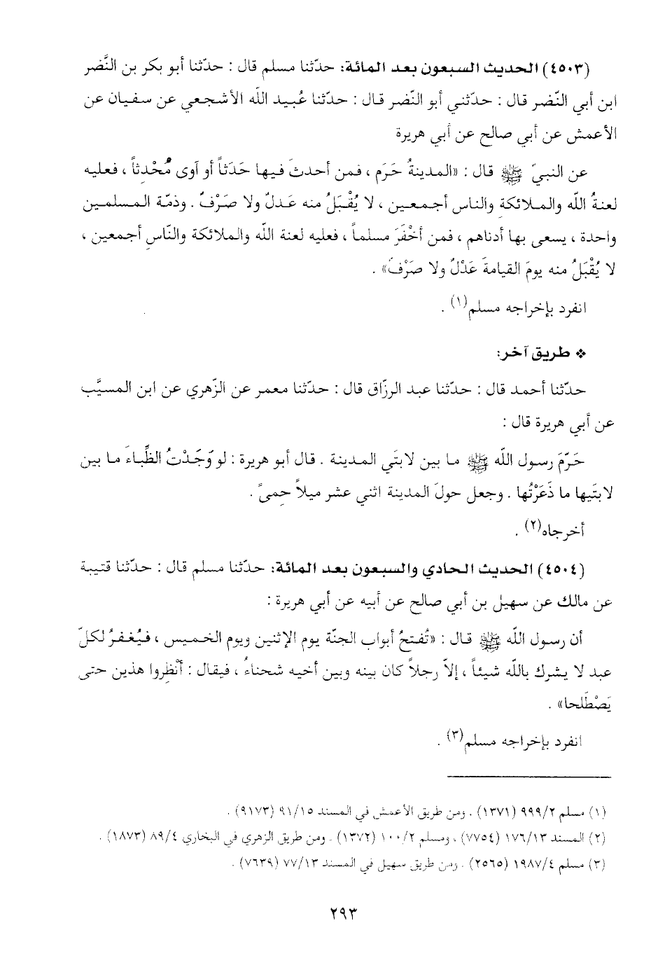(٤٥٠٣) الحديث السبعون بعد المائة: حدّثنا مسلم قال: حدّثنا أبو بكر بن النَّضر ابن أبي النّضر قال: حدّثني أبو النّضر قال: حدّثنا عُبيد اللَّه الأشجعي عن سفيان عن الأعمش عن أبي صالح عن أبي هريرة: