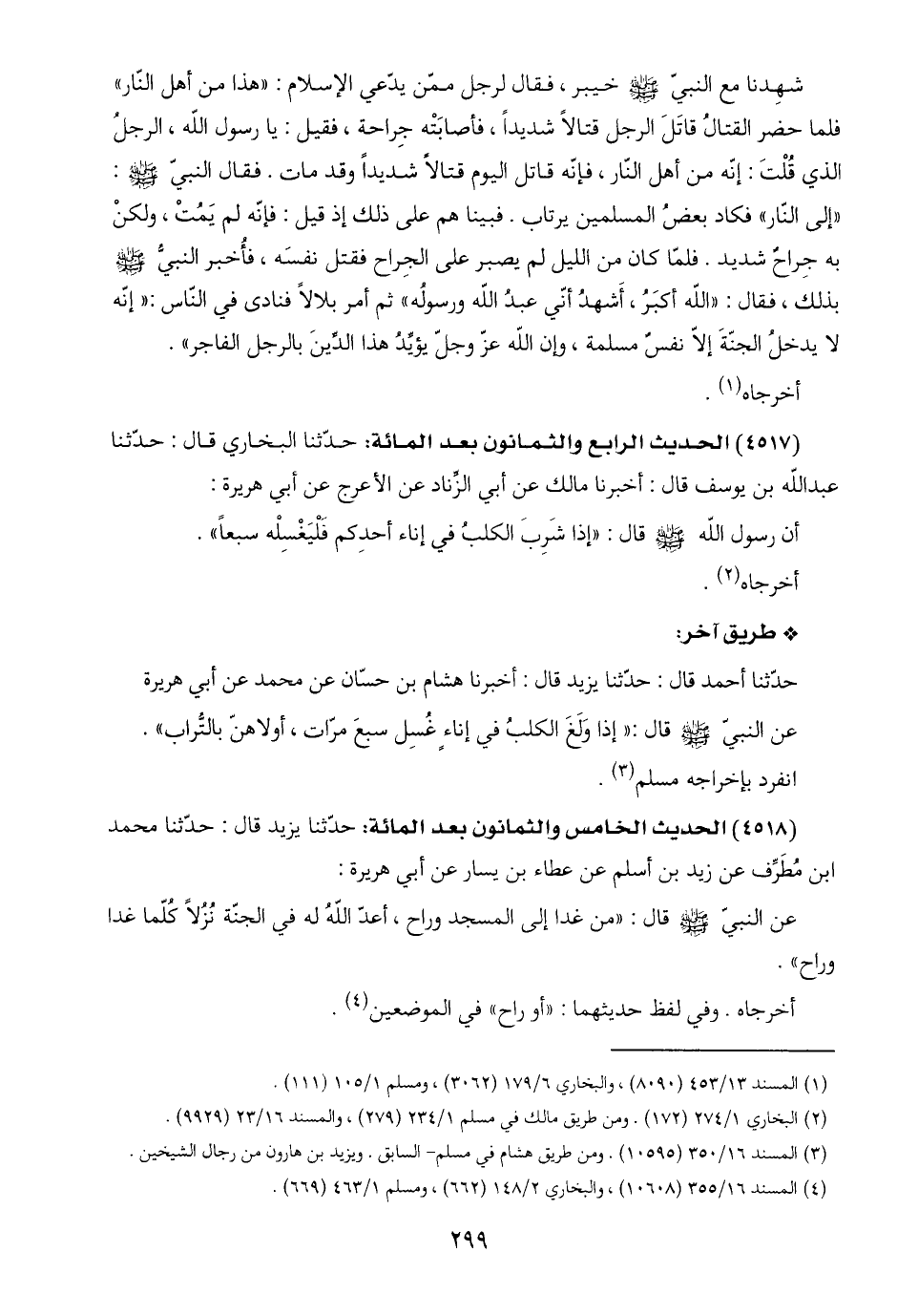 (٤٥١٧) الحديث الرابع والثمانون بعد المائة: حدّثنا البخاري قال: حدّثنا عبد اللَّه بن يوسف قال: أخبرنا مالك عن أبي الزِّناد عن الأعرج عن أبي هريرة: