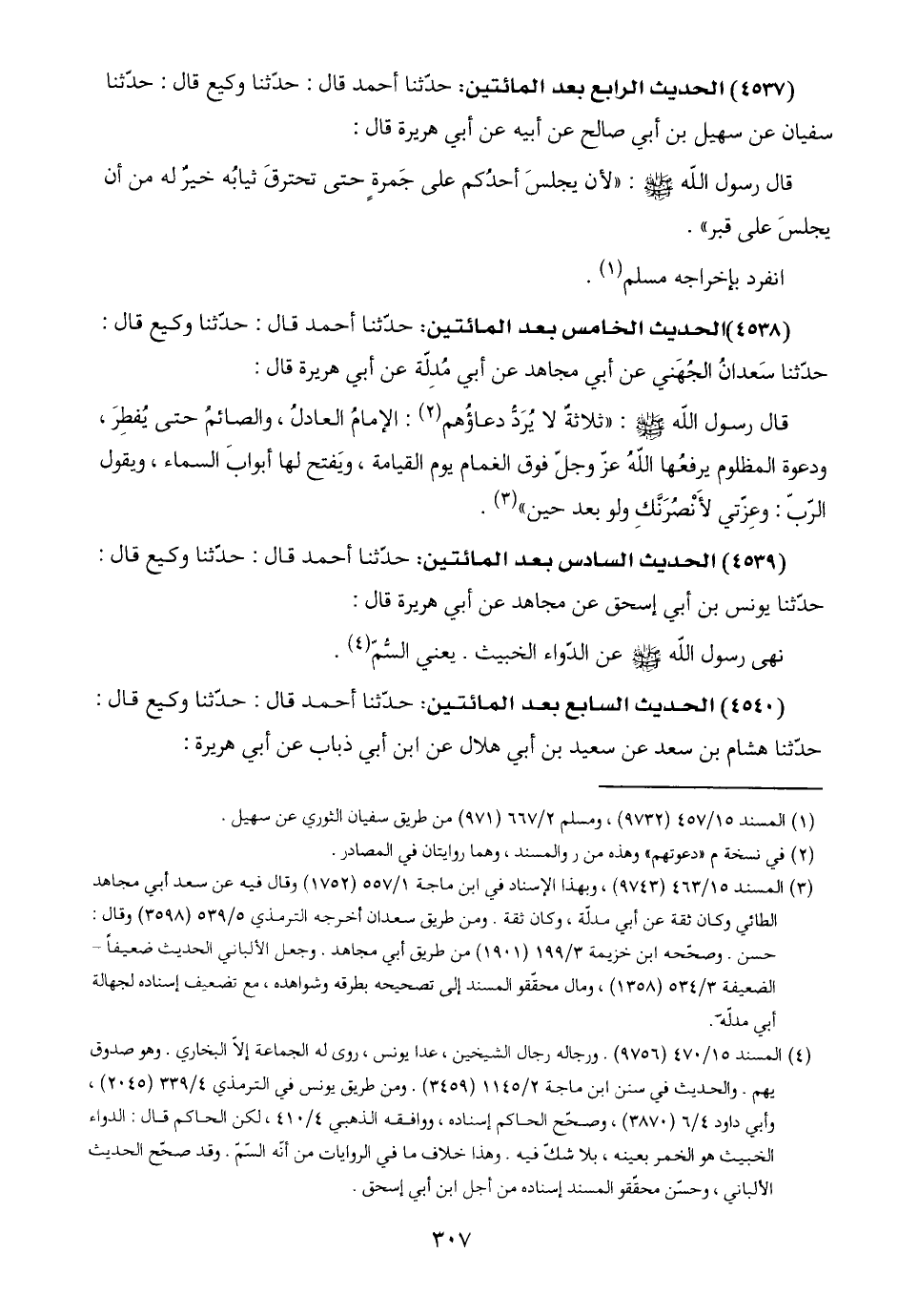 (٤٥٣٧) الحديث الرابع بعد المائتين: حدّثنا أحمد قال: حدّثنا وكيع قال: حدّثنا سفيان عن سهيل بن أبي صالح عن أبيه عن أبي هريرة قال: