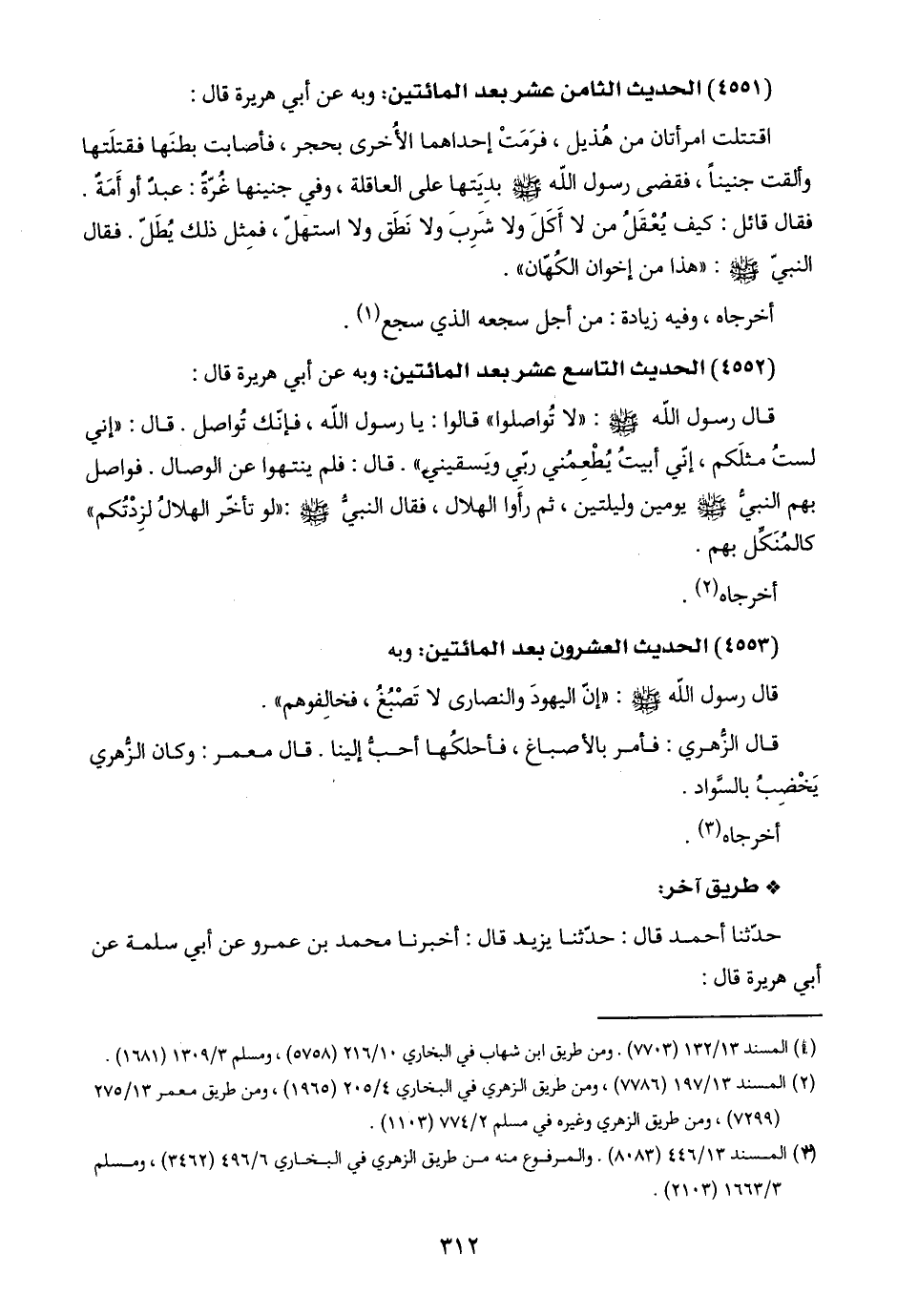 (٢) المسند ١٣/ ١٩٧ (٧٧٨٦)، ومن طريق الزهري في البخاري ٤/ ٢٠٥ (١٩٦٥)، ومن طريق معمر ١٣/ ٢٧٥ (٧٢٩٩)، ومن طريق الزهري وغيره في مسلم ٢/ ٧٧٤ (١١٠٣).
