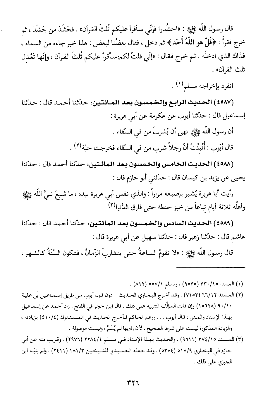 (٤٥٨٩) الحديث السادس والخمسون بعد المائتين: حدّثنا أحمد قال: حدّثنا هاشم قال: حدّثنا زهير قال: حدّثنا سهيل عن أبي هريرة قال: