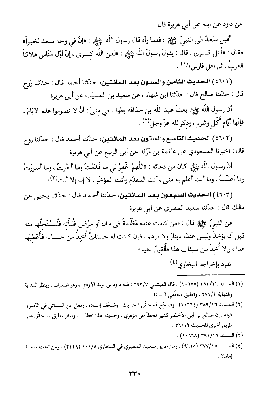 (٤) المسند ١٥/ ٣٧٧ (٩٦١٥). ومن طريق سعيد المقبري في البخاري ٥/ ١٠١ (٢٤٤٩). ومن تحت سعيد إمامان.