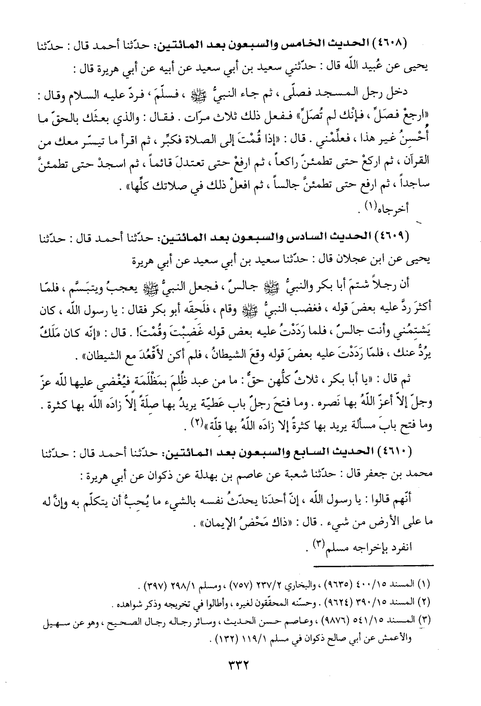 (٤٦٠٩) الحديث السادس والسبعون بعد المائتين: حدّثنا أحمد قال: حدّثنا يحيى عن ابن عجلان قال: حدّثنا سعيد بن أبي سعيد عن أبي هريرة: