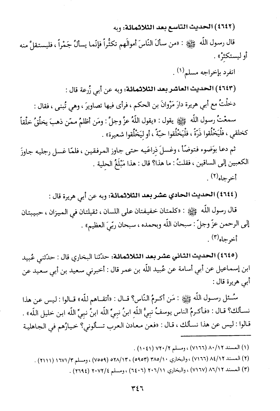 (٤٦٤٥) الحديث الثاني عشر بعد الثلاثمائة: حدّثنا البخاري قال: حدّثني عُبيد ابن إسماعيل عن أبي أسامة عن عُبيد اللَّه بن عمر قال: أخبرني سعيد بن أبي سعيد عن أبي هريرة قال: