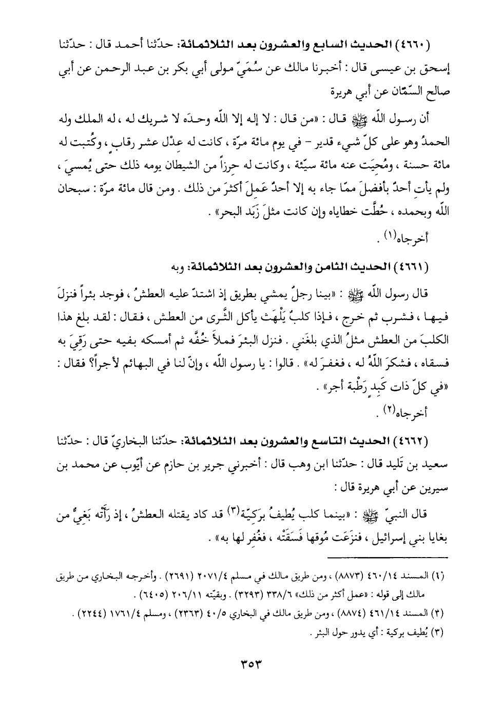 (٤٦٦٠) الحديث السابع والعشرون بعد الثلاثمائة: حدّثنا أحمد قال: حدّثنا إسحق بن عيسى قال: أخبرنا مالك عن سُمَيّ مولى أبي بكر بن عبد الرحمن عن أبي صالح السّمّان عن أبي هريرة: