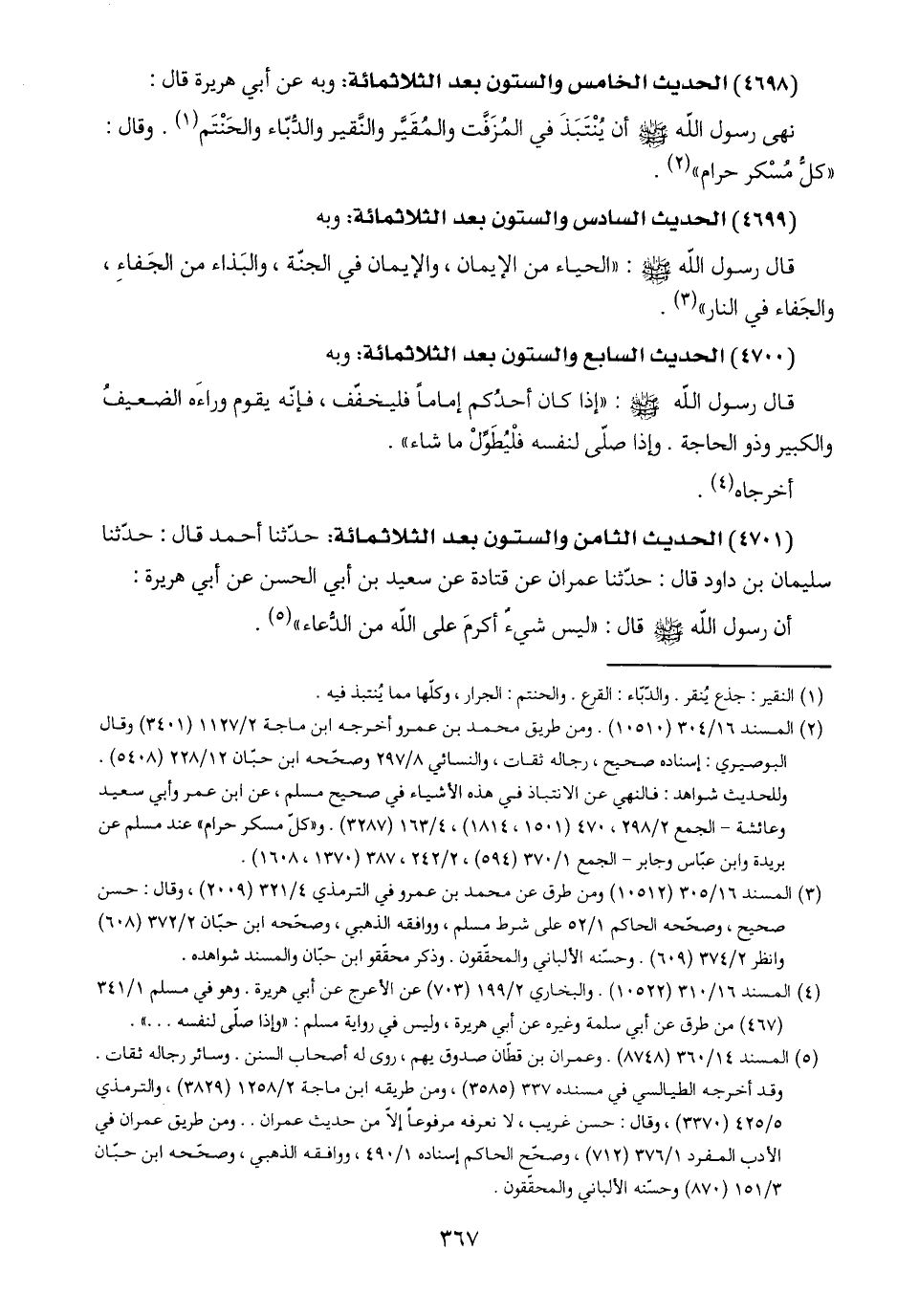 (٢) المسند ١٦/ ٣٠٤ (١٠٥١٠). ومن طريق محمد بن عمرو أخرجه ابن ماجة ٢/ ١١٢٧ (٣٤٠١) وقال البوصيري: إسناده صحيح، رجاله ثقات، والنسائي ٨/ ٢٩٧ وصحّحه ابن حبّان ١٢/ ٢٢٨ (٥٤٠٨). وللحديث شواهد: فالنهي عن الانتباذ في هذه الأشياء في صحيح مسلم، عن ابن عمر وأبي سعيد وعائشة - الجمع ٢/ ٢٩٨، ٤٧٠ (١٥٠١، ١٨١٤)، ٤/ ١٦٣ (٣٢٨٧). و"كلّ مسكر حرام" عند مسلم عن بريدة وابن عبّاس وجابر - الجمع ١/ ٣٧٠ (٥٩٤)، ٢/ ٢٤٢، ٣٨٧ (١٣٧٠، ١٦٠٨).