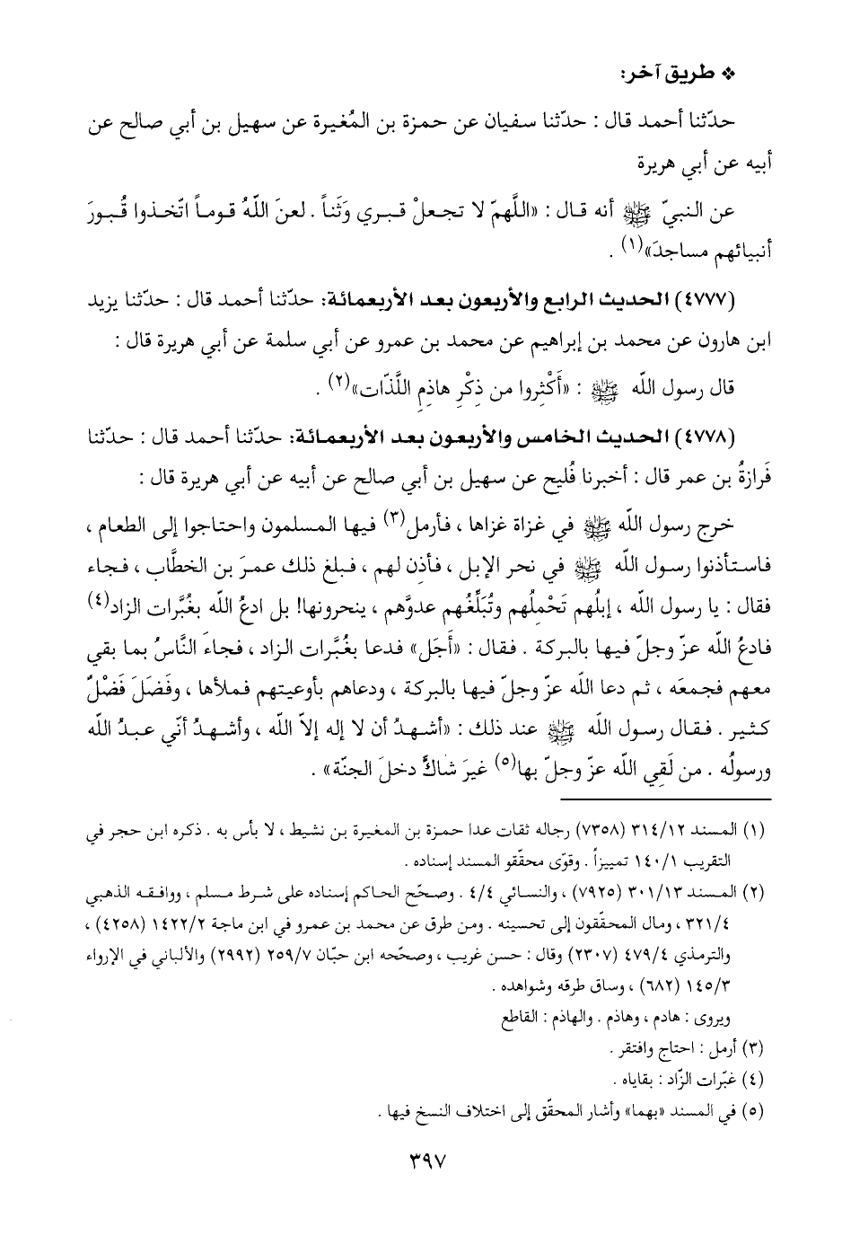 (٤٧٧٧) الحديث الرابع والأربعون بعد الأربعمائة: حدّثنا أحمد قال: حدّثنا يزيد ابن هارون عن محمد بن إبراهيم عن محمد بن عمرو عن أبي سلمة عن أبي هريرة قال: