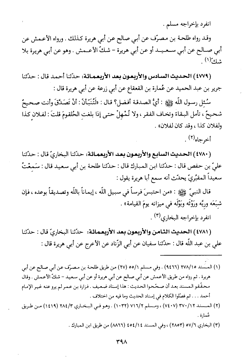 (٤٧٨٠) الحديث السابع والأربعون بعد الأربعمائة: حدّثنا البخاريّ قال: حدّثنا عليّ بن حفص قال: حدّثنا ابن المبارك قال: حدّثنا طلحة بن أبي سعيد قال: سَمِعْتُ سعيدًا المقبُريّ يحدّث أنّه سمع أبا هريرة يقول:
