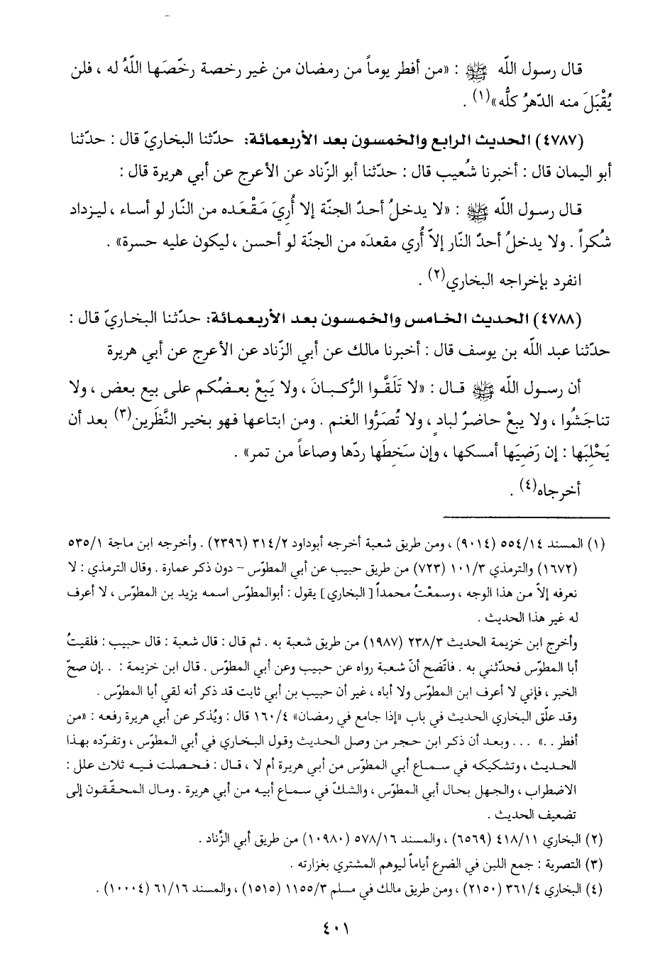 (٤٧٨٧) الحديث الرابع والخمسون بعد الأربعمائة: حدّثنا البخاريّ قال: حدّثنا أبو اليمان قال: أخبرنا شُعيب قال: حدّثنا أبو الزّناد عن الأعرج عن أبي هريرة قال: