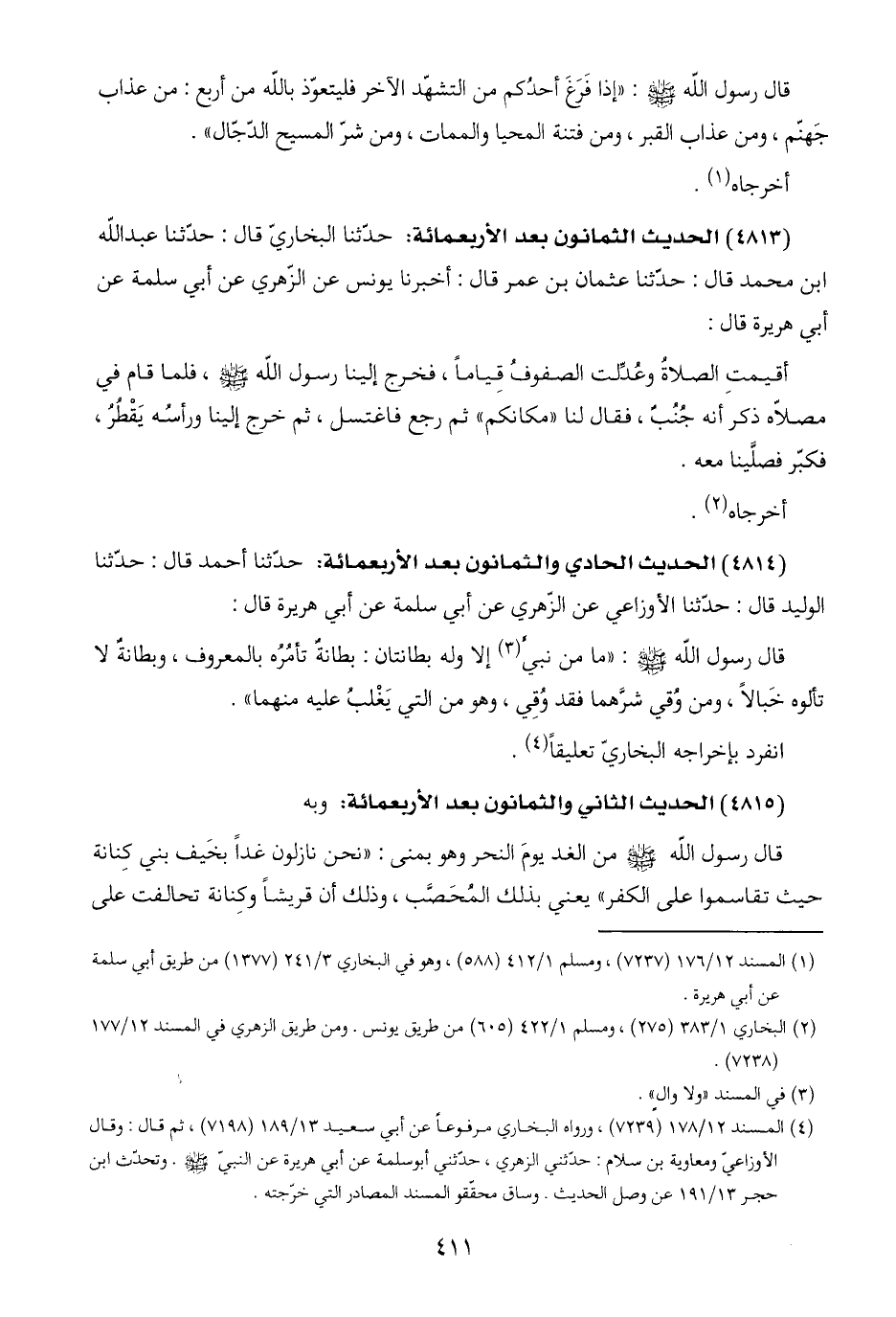 (٤٨١٣) الحديث الثمانون بعد الأربعمائة: حدّثنا البخاريّ قال: حدّثنا عبد اللَّه ابن محمد قال: حدّثنا عثمان بن عمر قال: أخبرنا يونس عن الزّهري عن أبي سلمة عن أبي هريرة قال:
