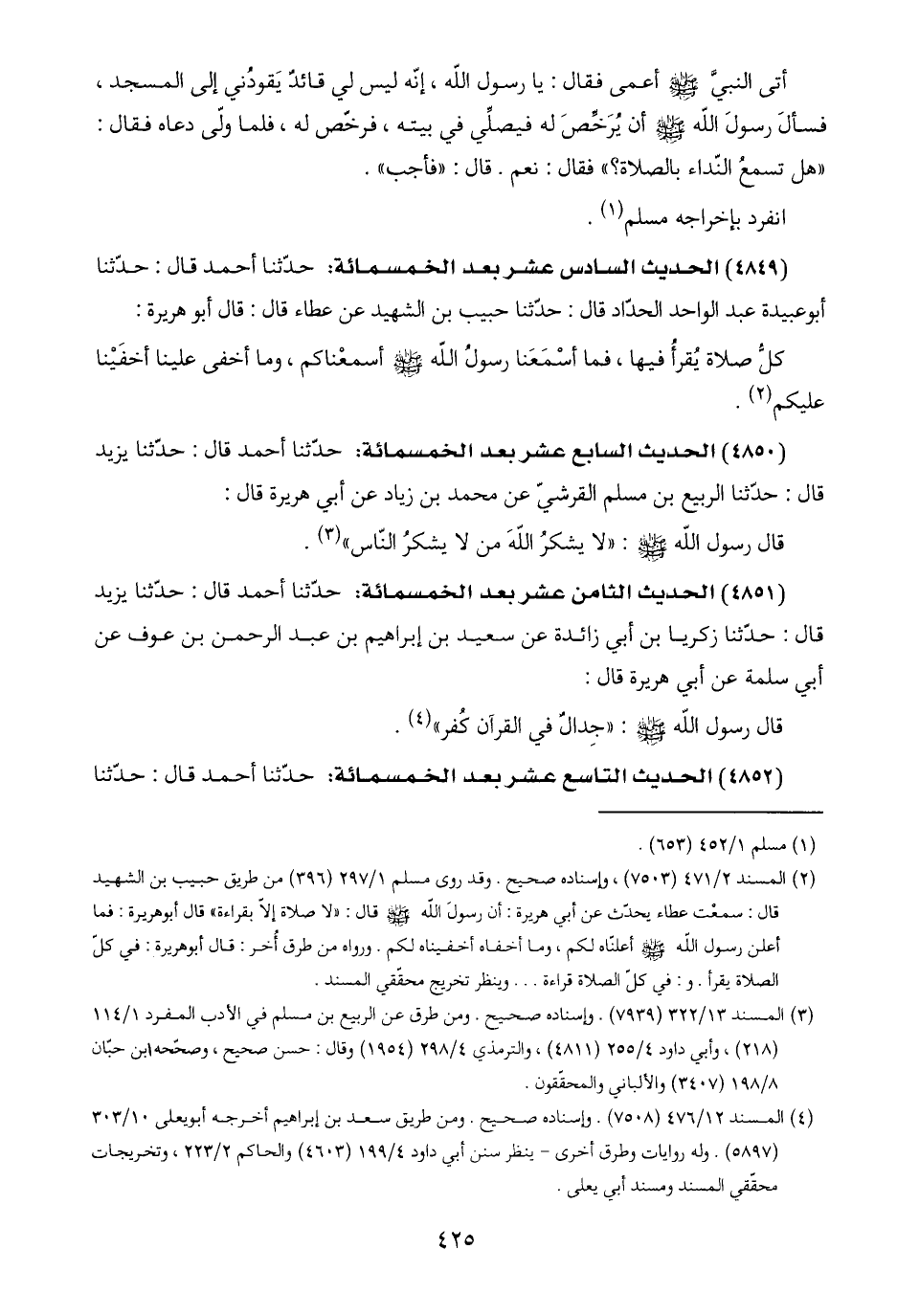 (٢) المسند ٢/ ٤٧١ (٧٥٠٣)، وإسناده صحيح. وقد روى مسلم ١/ ٢٩٧ (٣٩٦) من طريق حبيب بن الشهيد قال: سمعْت عطاء يحدّث عن أبي هريرة: أن رسولَ اللَّه -صلى اللَّه عليه وسلم- قال: "لا صلاة إلا بقراءة، قال أبو هريرة: فما أعلن رسول اللَّه -صلى اللَّه عليه وسلم- أعلنّاه لكم، وما أخفاه أخفيناه لكم. ورواه من طرق أُخر: قال أبو هريرة: في كلّ الصلاة يقرأ. و: في كلّ الصلاة قراءة .. . وينظر تخريج محقّقي المسند.