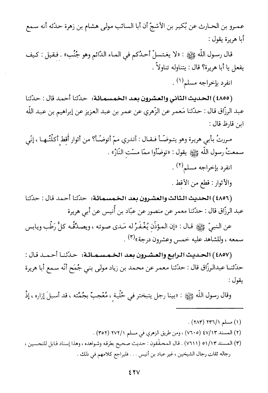(٤٨٥٧) الحديث الرابع والعشرون بعد الخمسمائة: حدّثنا أحمد قال: حدّثنا عبد الرزّاق قال: حدّثنا معمر عن محمد بن زياد مولى بني جُمَح أنّه سمع أبا هريرة يقول: