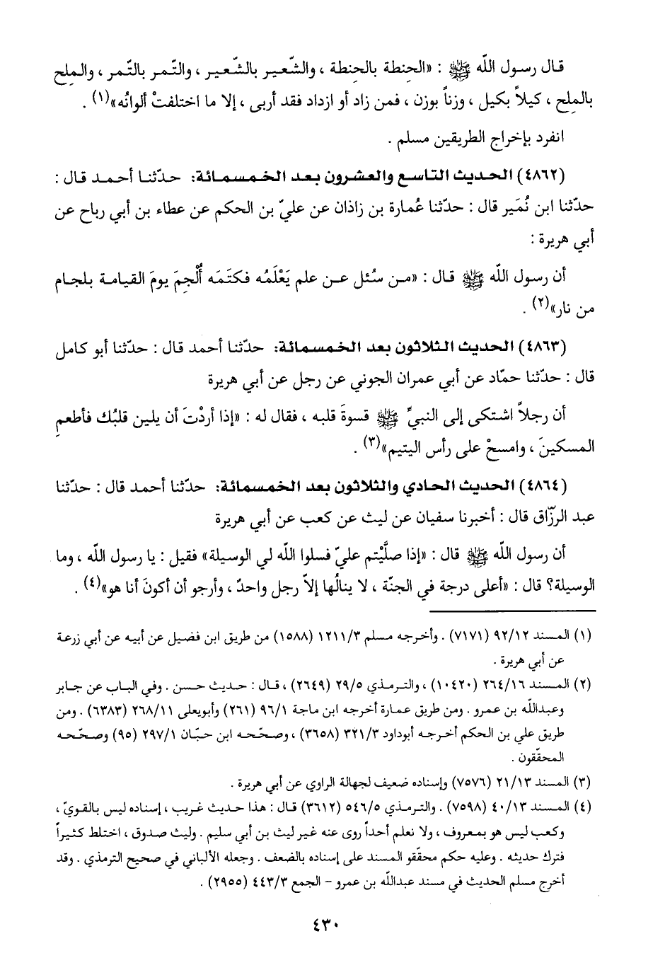 (٤٨٦٢) الحديث التاسع والعشرون بعد الخمسمائة: حدّثنا أحمد قال: حدّثنا ابن نُمَير قال: حدّثنا عُمارة بن زاذان عن عليّ بن الحكم عن عطاء بن أبي رباح عن أبي هريرة: