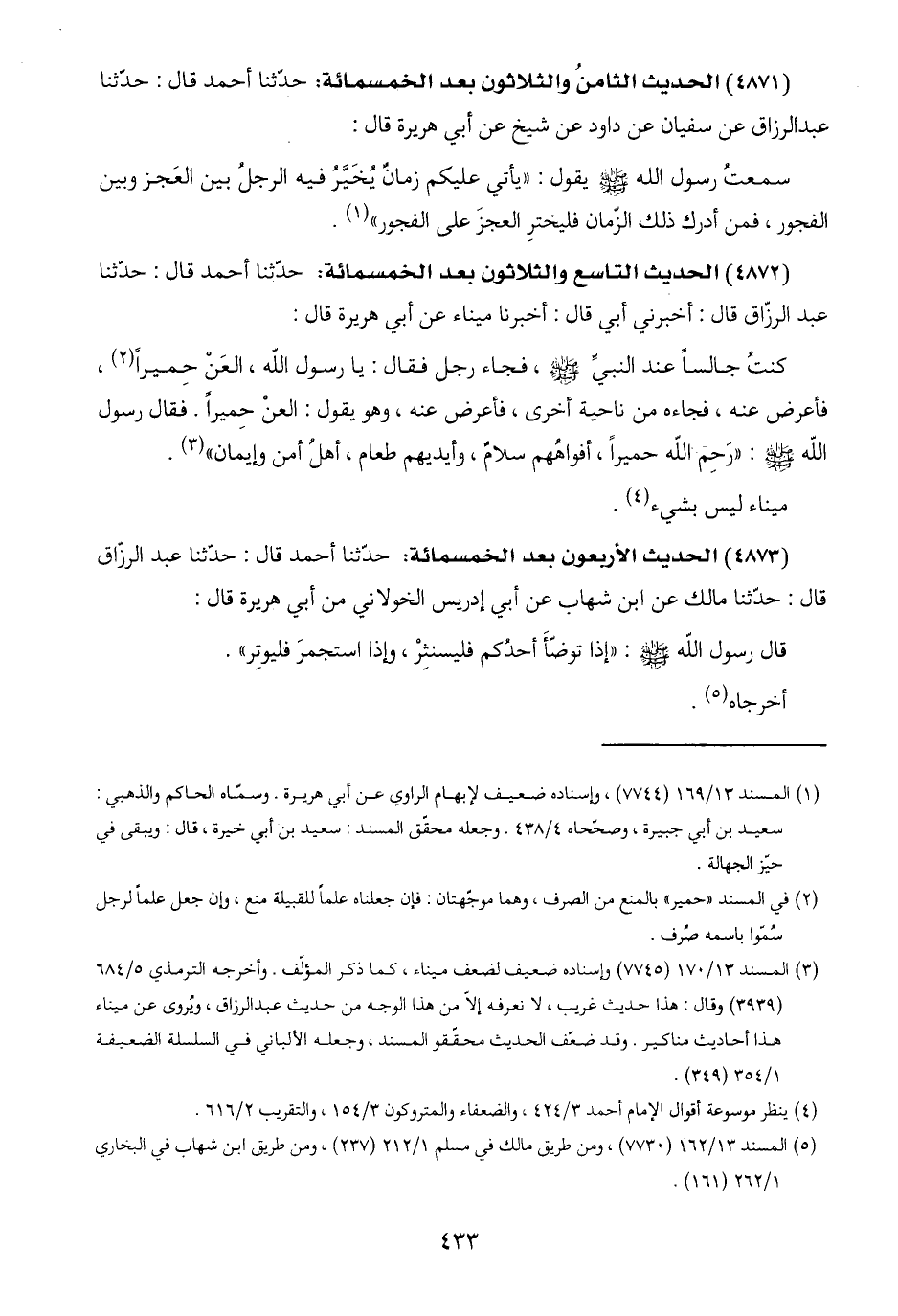 (٤٨٧٢) الحديث التاسع والثلاثون بعد الخمسمائة: حدّثنا أحمد قال: حدّثنا عبد الرزّاق قال: أخبرني أبي قال: أخبرنا ميناء عن أبي هريرة قال: