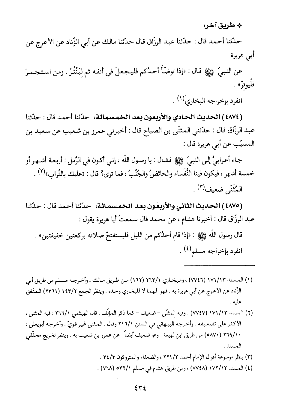 (٤٨٧٤) الحديث الحادي والأربعون بعد الخمسمائة: حدّثنا أحمد قال: حدّثنا عبد الرزّاق قال: حدّثني المثنّى بن الصباح قال: أخبرني عمرو بن شعيب عن سعيد بن المسيّب عن أبي هريرة قال: