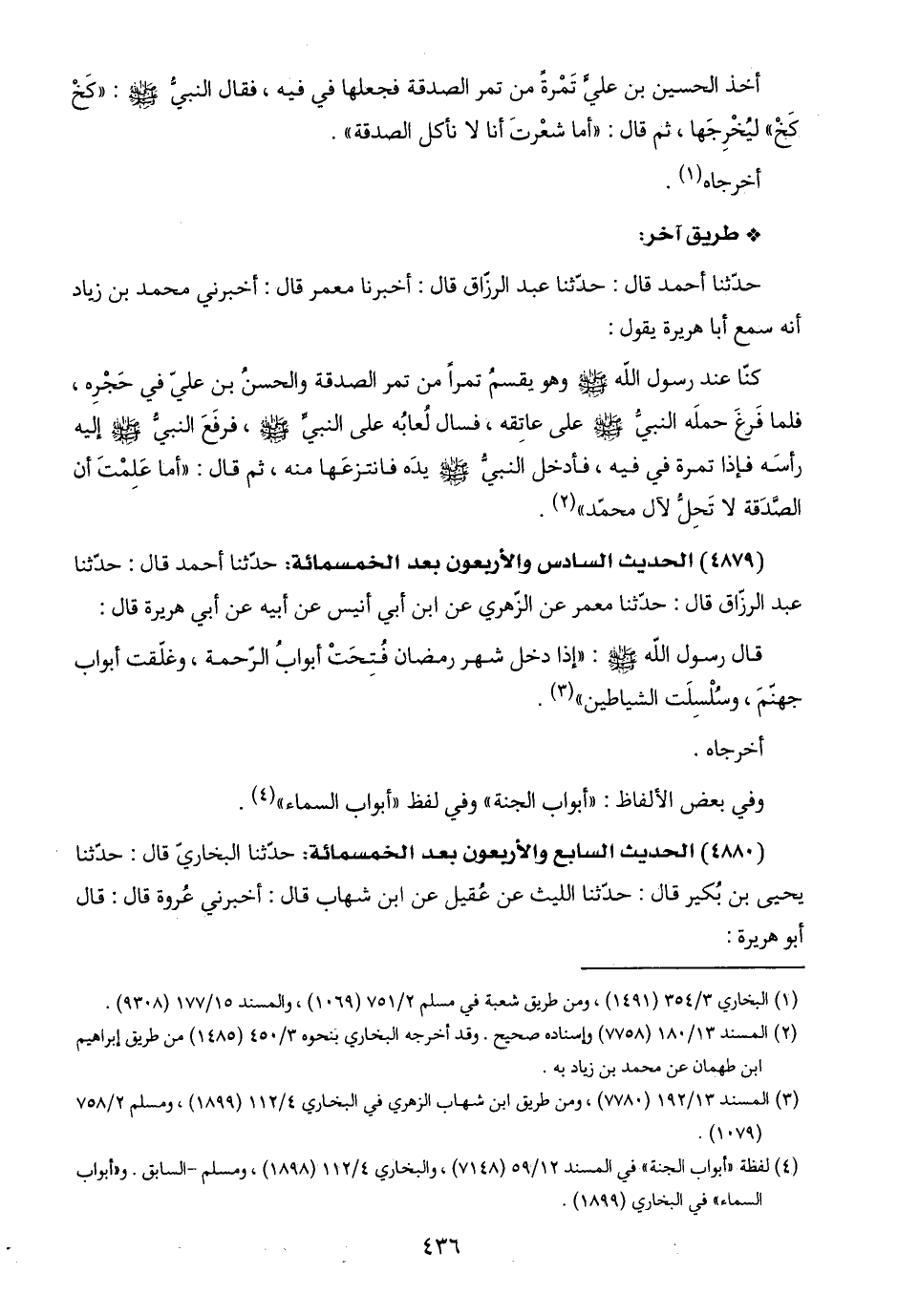 (٤٨٧٩) الحديث السادس والأربعون بعد الخمسمائة: حدّثنا أحمد قال: حدّثنا عبد الرزّاق قال: حدّثنا معمر عن الزّهري عن ابن أبي أنيس عن أبيه عن أبي هريرة قال: