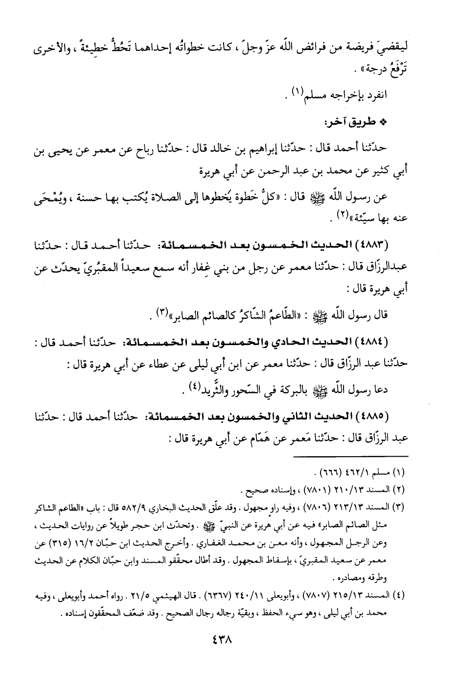 (٣) المسند ١٣/ ٢١٣ (٧٨٠٦)، وفيه راوٍ مجهول. وقد علّق الحديث البخاري ٩/ ٥٨٢ قال: باب "الطاعم الشاكر مثل الصائم الصابر" فيه عن أبي هريرة عن النبيّ -صلى اللَّه عليه وسلم-. وتحدّث ابن حجر طويلًا عن روايات الحديث، وعن الرجل المجهول، وأنَّه معن بن محمد الغفاري. وأخرج الحديث ابن حبّان ٢/ ١٦ (٣١٥) عن معمر عن سعيد المقبريّ، بإسقاط المجهول. وقد أطال محقّقو المسند وابن حبّان الكلام عن الحديث وطرقه ومصادره.