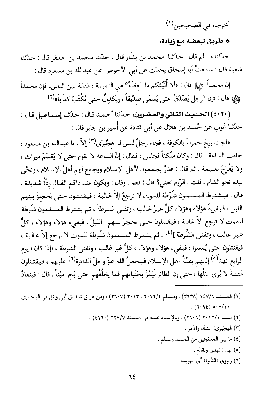 هاجت ريحٌ حمراءُ بالكوفة، فجاء رجلٌ ليس له هِجِّيرَى (٣) إلّا: يا عبد اللَّه بن مسعود، جاءتِ الساعة. قال: وكان متّكئًا فجلس، فقال: إنّ الساعة لا تقوم حتى لا يُقسَمَ ميراث، ولا يُفْرَحَ بغنيمة. ثم قال: عدوٌّ يجمعون لأهل الإسلام ويجمع لهم أهلُ الإسلام، ونحَّى بيده نحو الشام، قلت: الرّوم تعني؟ قال: نعم. وقال: ويكون عند ذاكم القتالِ رِدّةٌ شديدة. قال: فيشترط المسلمون شُرْطة للموت لا ترجعُ إلّا غالبة، فيقتتلون حتى يَحجِزَ بينهم الليل، فيفيءُ هؤلاء وهؤلاء كلٌّ غيرُ غالب، وتفنى الشرطةُ، ثم يشترط المسلمون شُرْطة للموت لا ترجع إلّا غالبة، فيقتتلون حتى يحجزَ بينهم [الليلُ، فيفيء هؤلاء وهؤلاء، كلٌّ غير غالب، وتفنى الشُّرطة] (٤). ثم يشترط المسلمون شُرطة للموت لا ترجع إلّا غالبة، فيقتتلون حتى يُمسوا، فيفيء هؤلاء وهؤلاء، كلٌّ غير غالب، وتفنى الشرطة، فإذا كان اليوم الرابع نَهَدَ (٥) إليهم بقيّةُ أهل الإسلام فيجعلُ اللَّه عزّ وجلّ الدائرة (٦) عليهم، فيقتتلون مَقتلةً لا يُرى مثلُها، حتى إنّ الطائر لَيَمُرُّ بجَنَباتهم فما يخلُفُهم حتى يَخِرَّ ميِّتًا. قال: فيتعادُّ