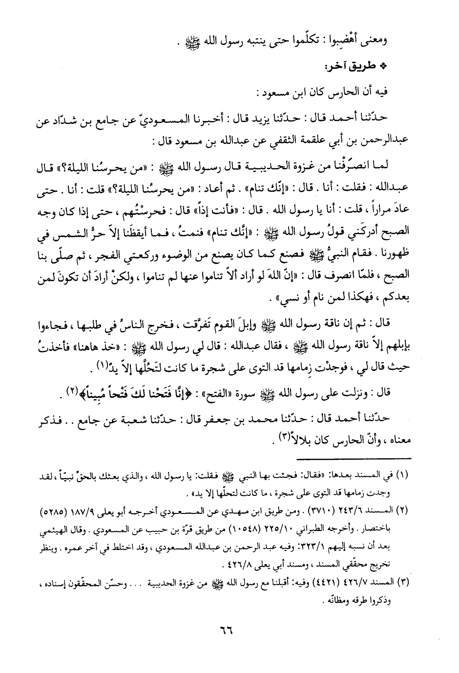 (٣) المسند ٧/ ٤٢٦ (٤٤٢١) وفيه: أقبلنا مع رسول اللَّه -صلى اللَّه عليه وسلم- من غزوة الحديبية. . . وحسّن المحقّقون إسناده، وذكروا طرقه ومظانّه.