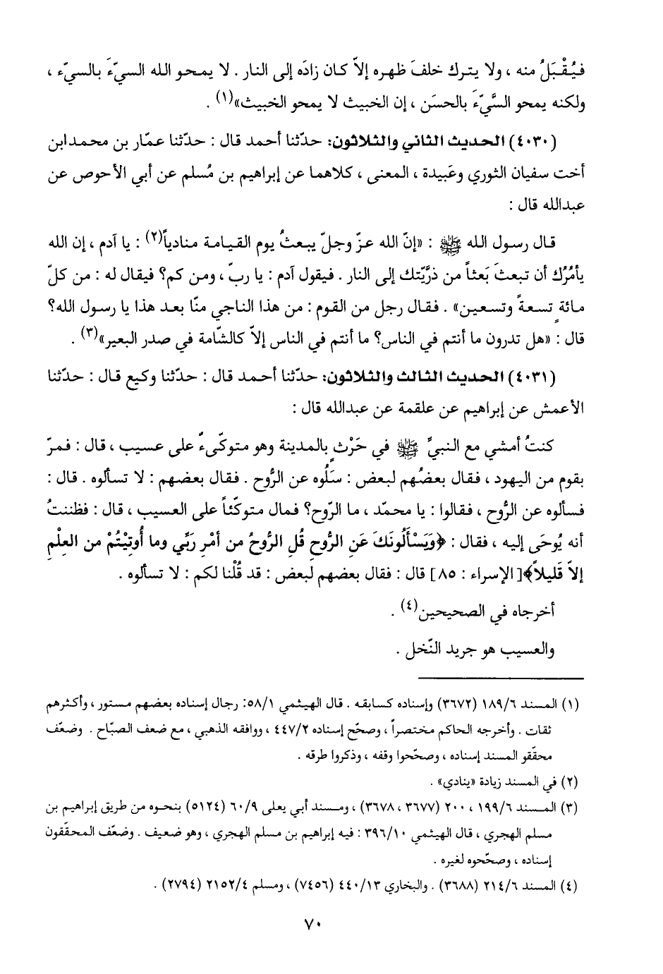 (٣) المسند ٦/ ١٩٩، ٢٠٠ (٣٦٧٧، ٣٦٧٨)، ومسند أبي يعلى ٩/ ٦٠ (٥١٢٤) بنحوه من طريق إبراهيم بن مسلم الهجري، قال الهيثمي ١٠/ ٣٩٦: فيه إبراهيم بن مسلم الهجري، وهو ضعيف. وضعّف المحقّقون إسناده، وصحّحوه لغيره.