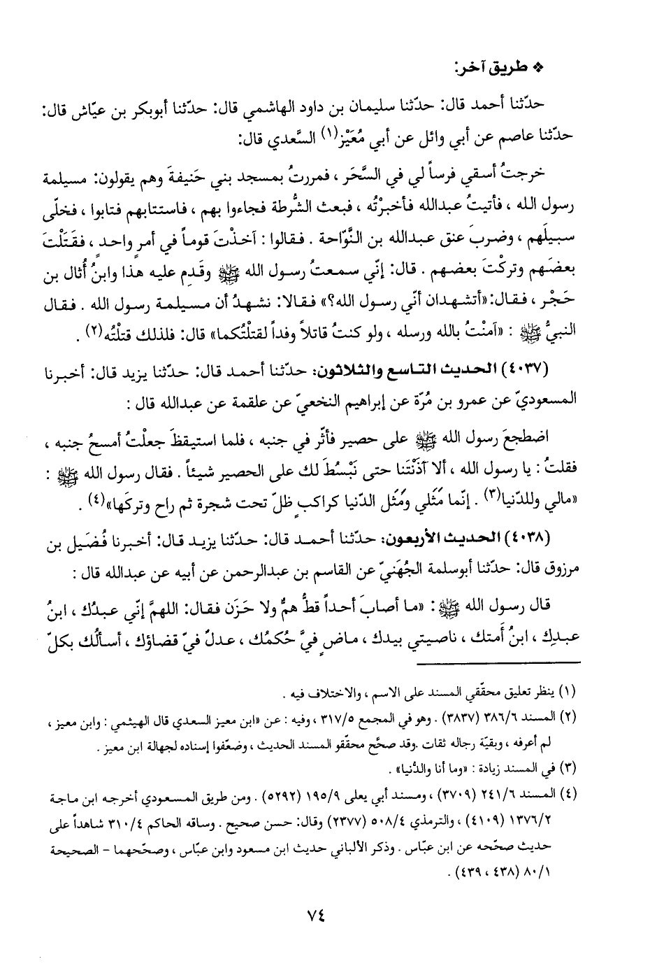 (٢) المسند ٦/ ٣٨٦ (٣٨٣٧). وهو في المجمع ٧/ ٣١٥، وفيه: عن "ابن معيز السعدي قال الهيثميّ: وابن معيز، لم أعرفه، وبقيّة رجاله ثقات. وقد صحح محقّقو المسند الحديث، وضعّفوا إسناده لجهالة ابن معيز.