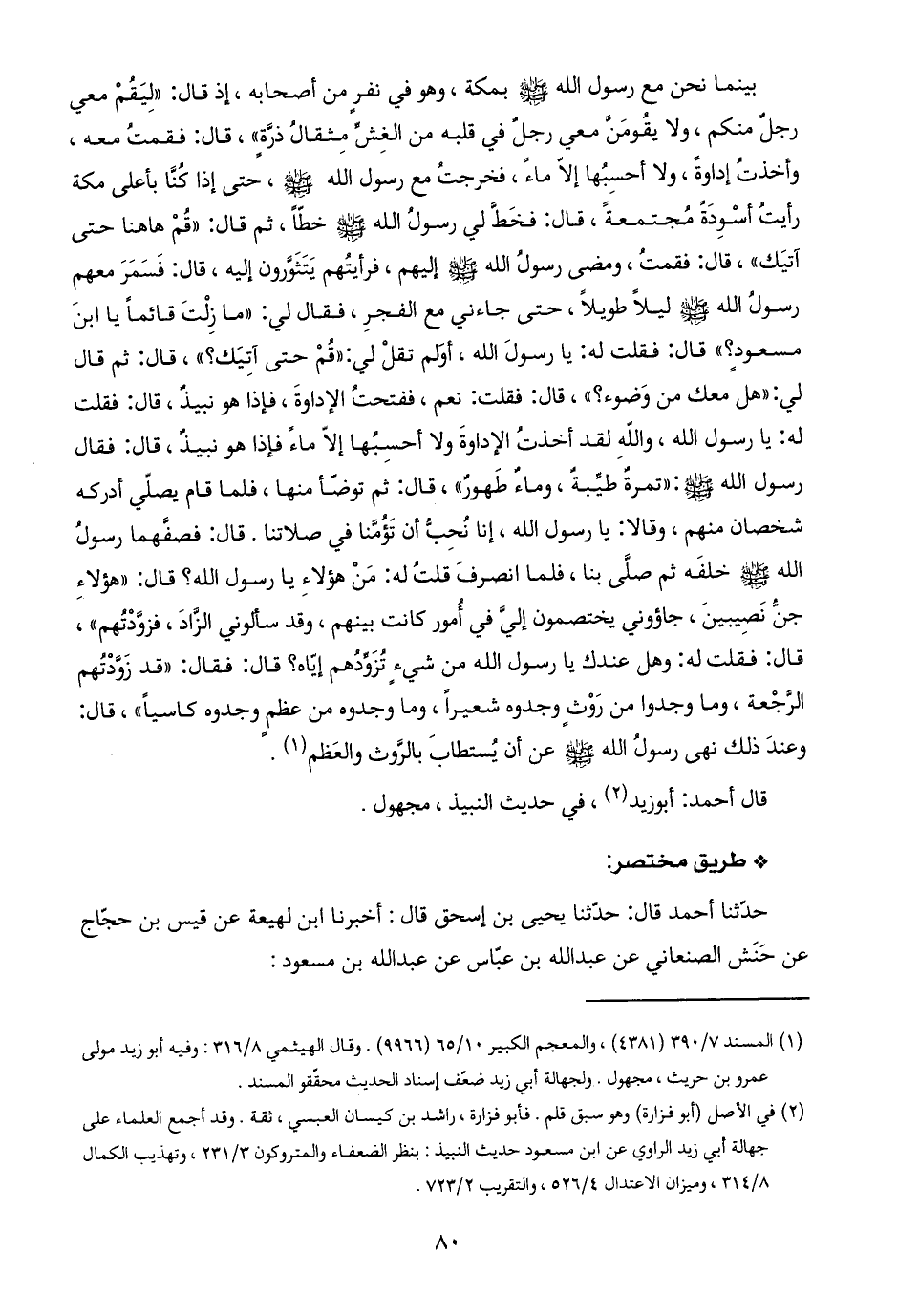 بينما نحن مع رسول اللَّه -صلى اللَّه عليه وسلم- بمكة، وهو في نفرٍ من أصحابه، إذ قال: "لِيَقُمْ معي رجلٌ منكم، ولا يقُومَنَّ معي رجلٌ في قلبه من الغِشِّ مِثقالُ ذرَّةٍ"، قال: فقمتُ معه، وأخذتُ إداوةً، ولا أحسِبُها إلّا ماءً، فخرجتُ مع رسول اللَّه -صلى اللَّه عليه وسلم-، حتى إذا كُنَّا بأعلى مكة رأيتُ أسْوِدَةً مُجتمعةً، قال: فخَطَّ لي رسولُ اللَّه -صلى اللَّه عليه وسلم- خطًّا، ثم قال: "قُمْ هاهنا حتى آتيَك"، قال: فقمتُ، ومضى رسولُ اللَّه -صلى اللَّه عليه وسلم- إليهم، فرأيتُهم يَتَثَوَّرون إليه، قال: فَسَمَرَ معهم رسولُ اللَّه -صلى اللَّه عليه وسلم- ليلًا طويلًا، حتى جاءني مع الفجرِ، فقال لي: "ما زِلْتَ قائمًا يا ابنَ مسعودٍ؟ " قال: فقلت له: يا رسولَ اللَّه، أوَلم تقلْ لي: "قُمْ حتى آتِيَك؟ "، قال: ثم قال لي: "هل معك من وَضوء؟ "، قال: فقلت: نعم، ففتحتُ الإداوةَ، فإذا هو نبيذٌ، قال فقلت له: يا رسول اللَّه، واللَّهِ لقد أخذتُ الإداوةَ ولا أحسِبُها إلّا ماءً فإذا هو نبيذٌ، قال: فقال رسول اللَّه -صلى اللَّه عليه وسلم-: "تمرةٌ طيِّبةٌ، وماءٌ طَهورٌ"، قال: ثم توضّأ منها، فلما قام يصلّي أدركه شخصان منهم، وقالا: يا رسول اللَّه، إنا نُحِبُّ أن تَؤُمَّنا في صلاتنا. قال: فصفَّهما رسولُ اللَّه -صلى اللَّه عليه وسلم- خلفَه ثم صلَّى بنا، فلما انصرفَ قلتُ له: مَنْ هؤلاءِ يا رسول اللَّه؟ قال: "هؤلاءِ جنٌّ نَصِيبينَ، جاؤوني يختصمون إليَّ في أُمور كانت بينهم، وقد سألوني الزَّادَ، فزوَّدْتهم"، قال: فقلت له: وهل عندك يا رسول اللَّه من شيءٍ تُزَوِّدُهم إيّاه؟ قال: فقال: "قد زَوَّدْتُهم الرَّجْعة، وما وجدوا من رَوْثٍ وجدوه شعيرًا، وما وجدوه من عظمٍ وجدوه كاسيًا"، قال: وعندَ ذلك نهى رسولُ اللَّه -صلى اللَّه عليه وسلم- عن أن يُستطابَ بالرَّوث والعَظم (١).