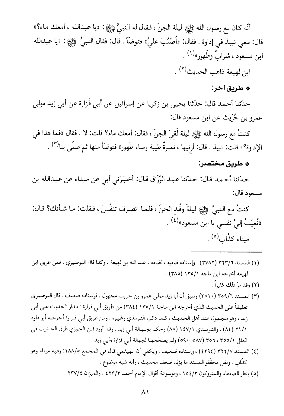 أنّه كان مع رسول اللَّه -صلى اللَّه عليه وسلم- ليلة الجنّ، فقال له النبيُّ -صلى اللَّه عليه وسلم-: "يا عبد اللَّه، أمعك ماء؟ " قال: معي نبيذ في إداوة. فقال: "اصْبُبْ عليَّ" فتوضّأ. قال: فقال النبيُّ -صلى اللَّه عليه وسلم-: "يا عبد اللَّه ابن مسعود، شرابٌ وطَهور" (١).