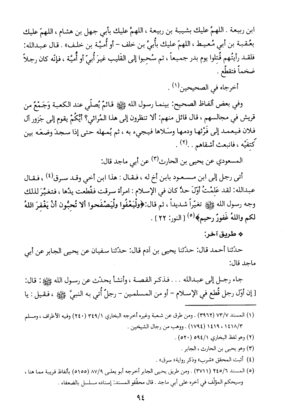 جاء رجل إلى عبد اللَّه. . . فذكر القصة، وأنشأ يحدّث عن رسول اللَّه -صلى اللَّه عليه وسلم-: قال: [إنّ أوّل رجل قُطع في الإسلام -أو من المسلمين- رجلٌ أُتي به النبيَّ -صلى اللَّه عليه وسلم-، فقيل: يا