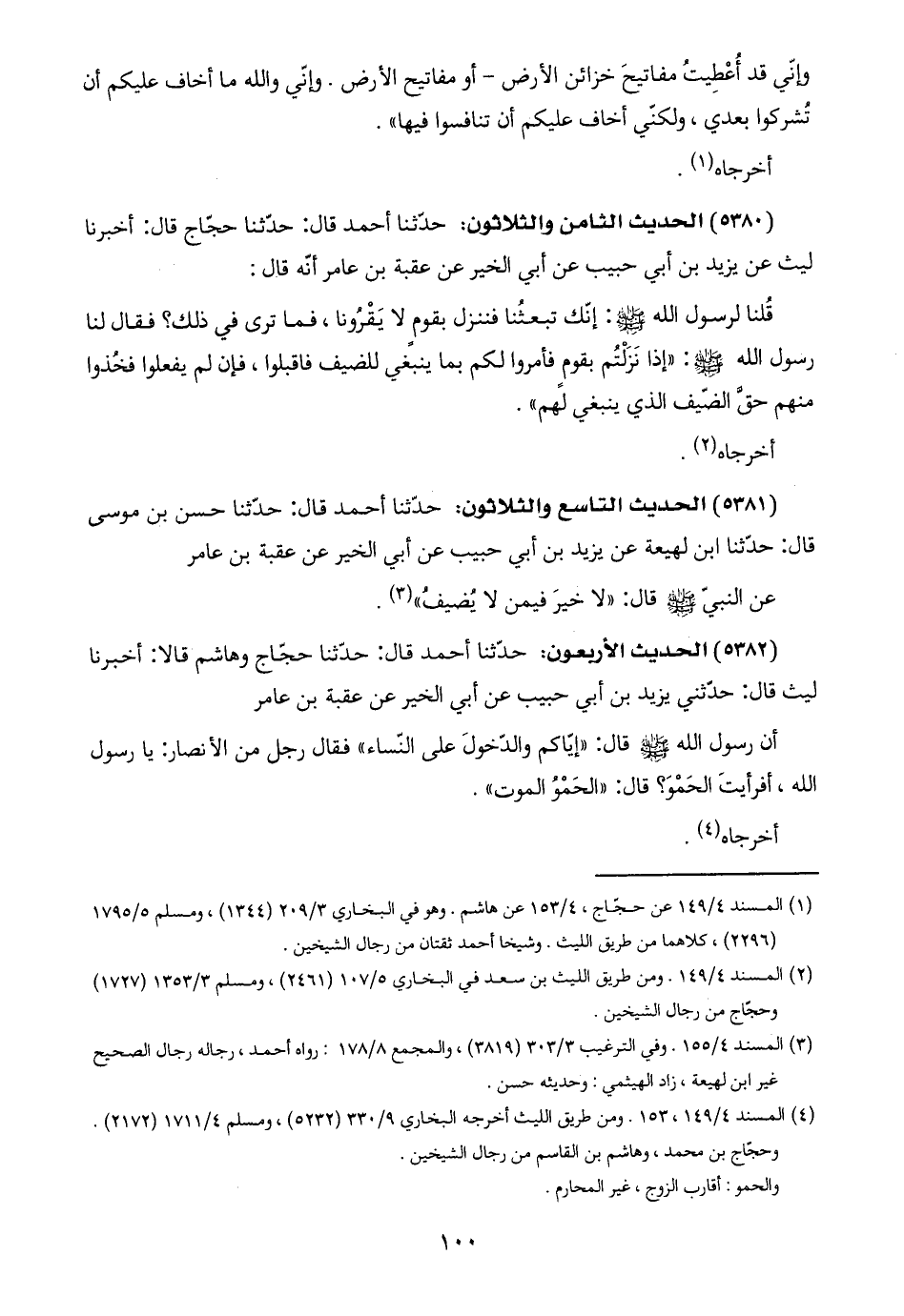 (٥٣٨٢) الحديث الأربعون: حدّثنا أحمد قال: حدّثنا حجّاج وهاشم قالا: أخبرنا ليث قال: حدّثني يزيد بن أبي حبيب عن أبي الخير عن عقبة بن عامر: