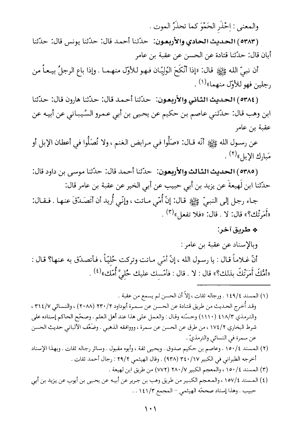 (١) المسند ٩/ ١٤٩. ورجاله ثقات، إلّا أن الحسن لم يسمع من عقبة.