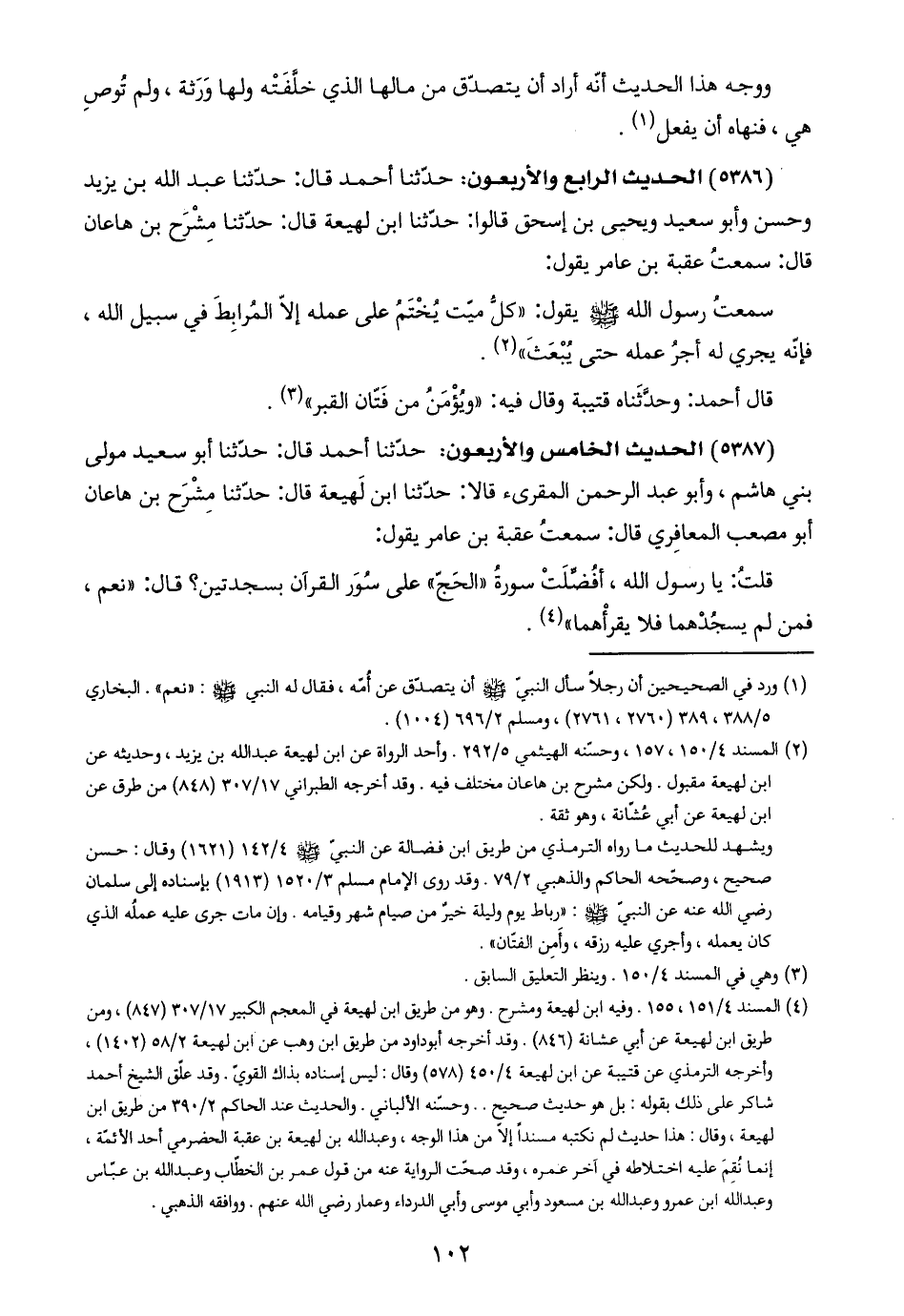 (٥٣٨٧) الحديث الخامس والأربعون: حدّثنا أحمد قال: حدّثنا أبو سعيد مولى بني هاشم، وأبو عبد الرحمن المقرىء قالا: حدّثنا ابن لَهيعة قال: حدّثنا مِشْرَح بن هاعان أبو مصعب المعافِري قال: سمعتُ عقبة بن عامر يقول: