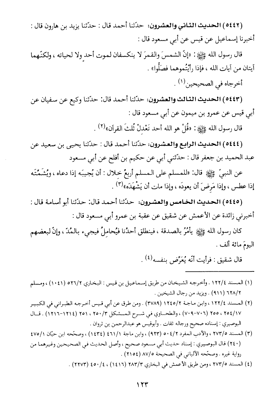 (٥٤٤٢) الحديث الثاني والعشرون: حدّثنا أحمد قال: حدّثنا يزيد بن هارون قال: أخبرنا إسماعيل عن قيس عن أبي مسعود قال:
