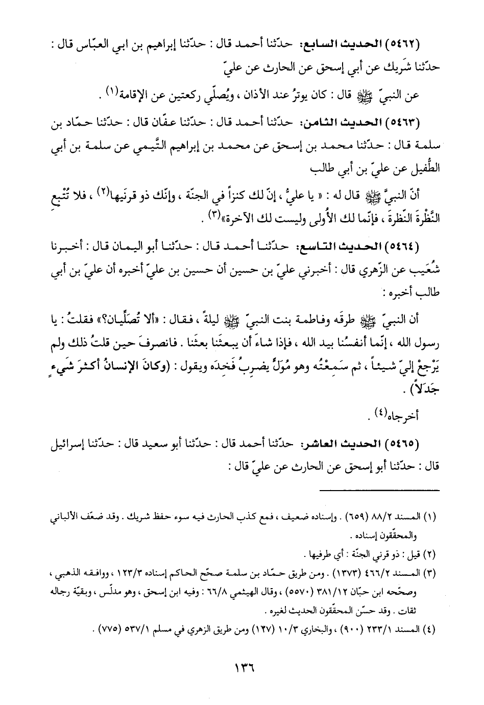 (٥٤٦٣) الحديث الثامن: حدّثنا أحمد قال: حدّثنا عفّان قال: حدّثنا حمّاد بن سلمة قال: حدّثنا محمد بن إسحق عن محمد بن إبراهيم التَّيمي عن سلمة بن أبي الطُّفيل عن عليّ بن أبي طالب: