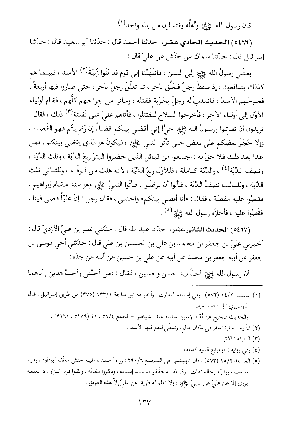 (٥٤٦٧) الحديث الثاني عشر: حدّثنا عبد اللَّه قال: حدّثني نصر بن عليّ الأزديّ قال: أخبرني عليّ بن جعفر بن محمد بن عليّ بن الحسين بن عليّ قال: حدّثني أخي موسى بن جعفر عن أبيه جعفر بن محمد عن أبيه عن علي بن حسين عن أبيه عن جدّه: