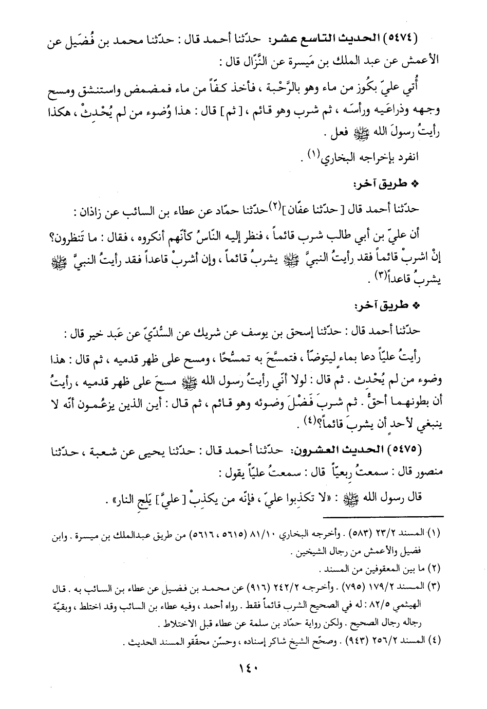 (٣) المسند ٢/ ١٧٩ (٧٩٥). وأخرجه ٢/ ٢٤٢ (٩١٦) عن محمد بن فضيل عن عطاء بن السائب به. قال الهيثمي ٥/ ٨٢: له في الصحيح الشرب قائمًا فقط. رواه أحمد، وفيه عطاء بن السائب وقد اختلط، وبقيّة رجاله رجال الصحيح. ولكن رواية حمّاد بن سلمة عن عطاء قبل الاختلاط.