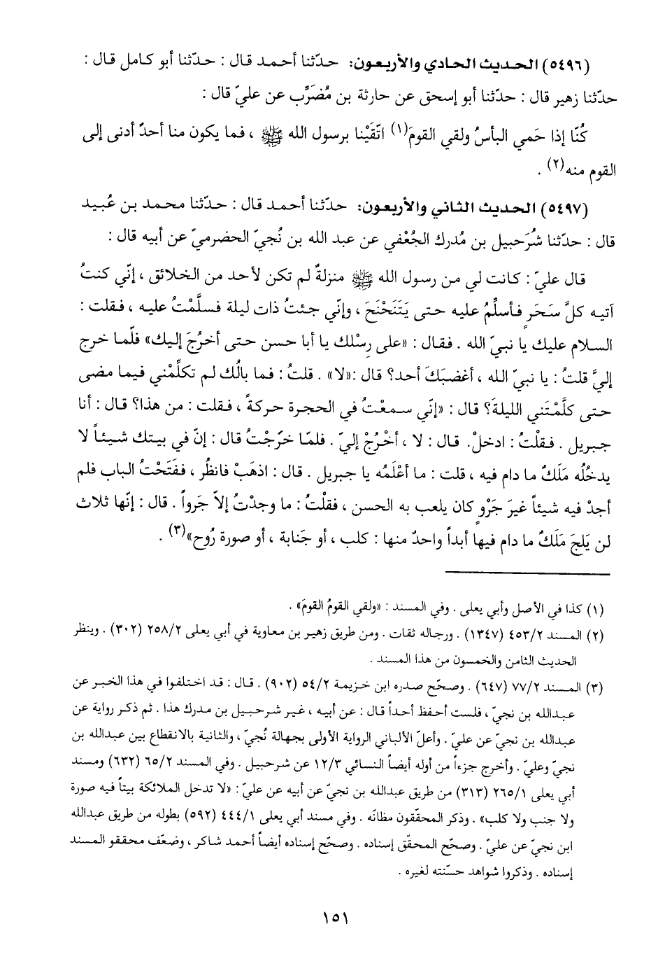 (٥٤٩٦) الحديث الحادي والأربعون: حدّثنا أحمد قال: حدّثنا أبو كامل قال: حدّثنا زهير قال: حدّثنا أبو إسحق عن حارثة بن مُضَرِّب عن عليّ قال: